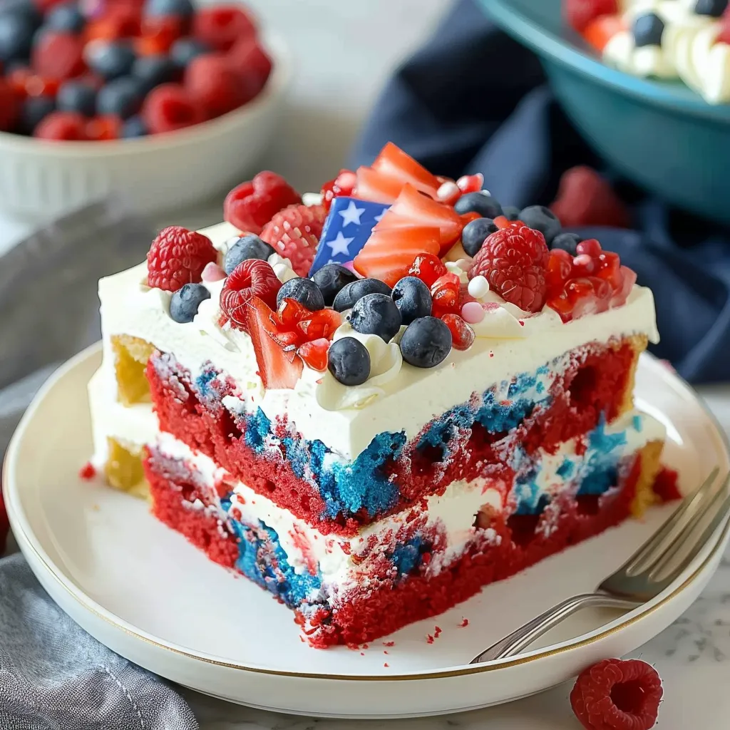 This 4th of July Patriotic Poke Cake is more than just a dessert; it’s an experience meant to be shared with loved ones during the spirit of celebration. Its vibrant colors and delightful layers will not only captivate the eyes but also please the palate, making it the perfect centerpiece for your Independence Day festivities. Don’t hesitate to let your creativity shine through as you create your version of this classic treat.