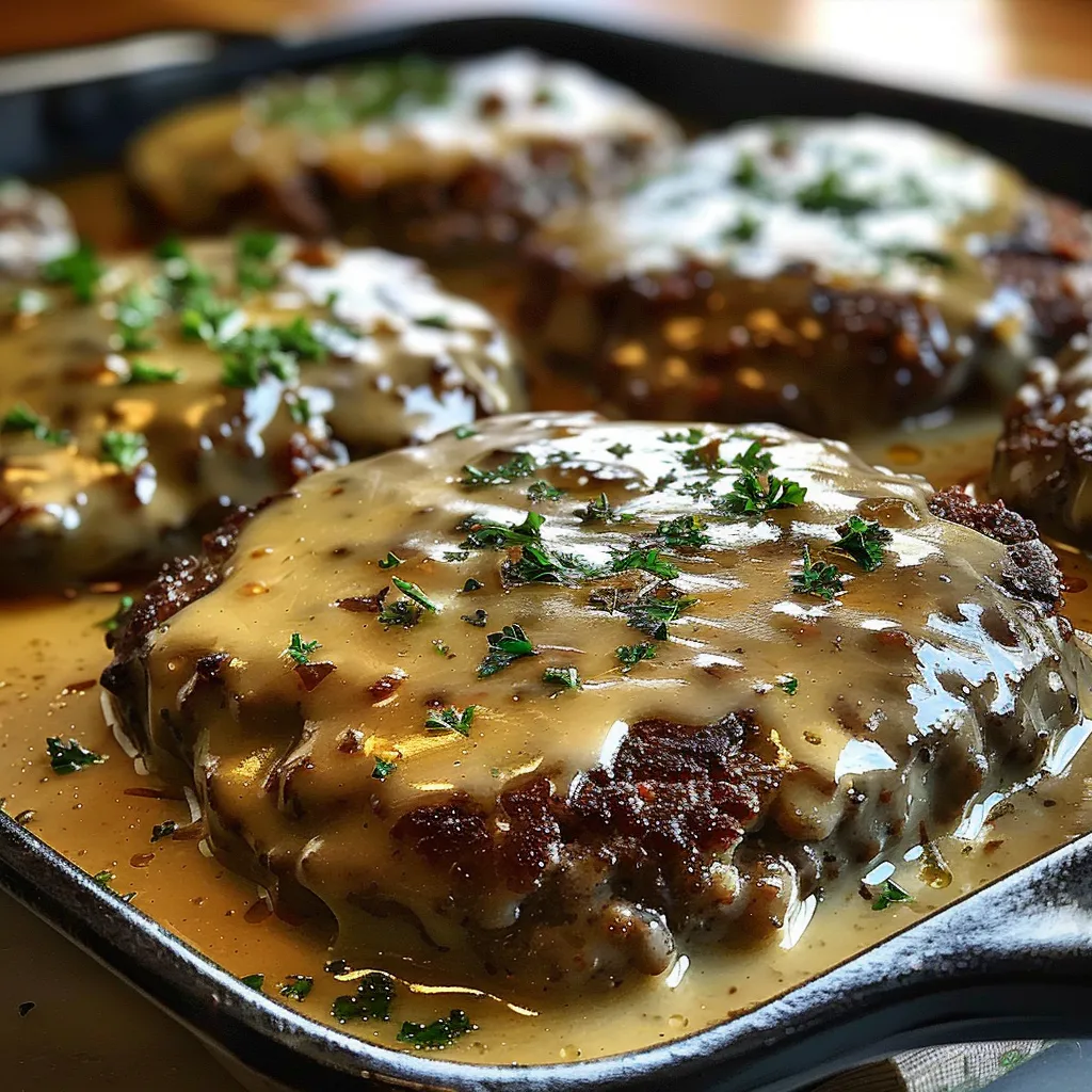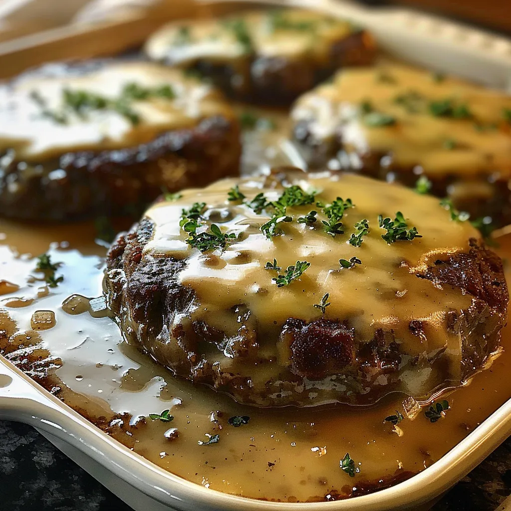 Picture this: a tender, juicy hamburger steak nestled in a bed of creamy gravy, all lovingly baked in a dish until bubbling and golden. The flavor is a delightful harmony of savory goodness, with each bite reminiscent of a beloved diner meal, but with that homemade touch that makes you feel like you’re in a grandma’s kitchen. The beef is rich and satisfying; the gravy is smooth and velvety, while the onions offer a sweet lift that dances playfully in every forkful.