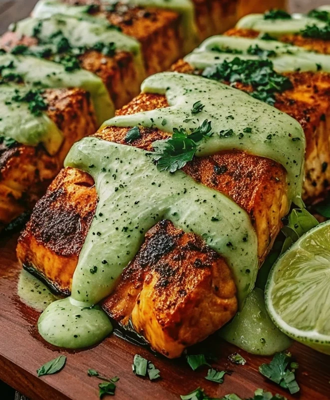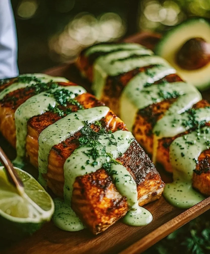 Savor Baked Cajun Salmon complemented by a zesty Avocado Lime Sauce a perfect dish for flavor lovers seeking a delicious meal experience