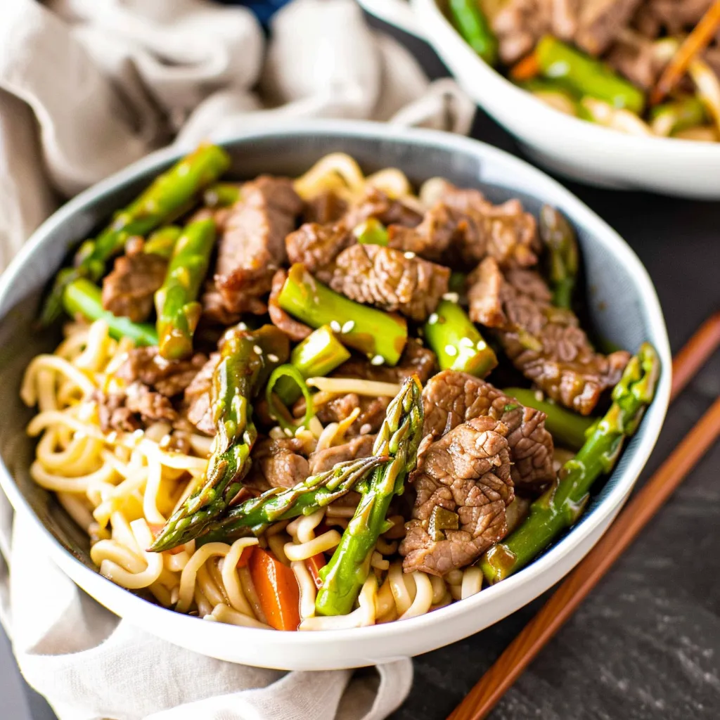 A delicious and comforting beef lo mein dish with fresh asparagus, perfect for cozy family dinners and gatherings.