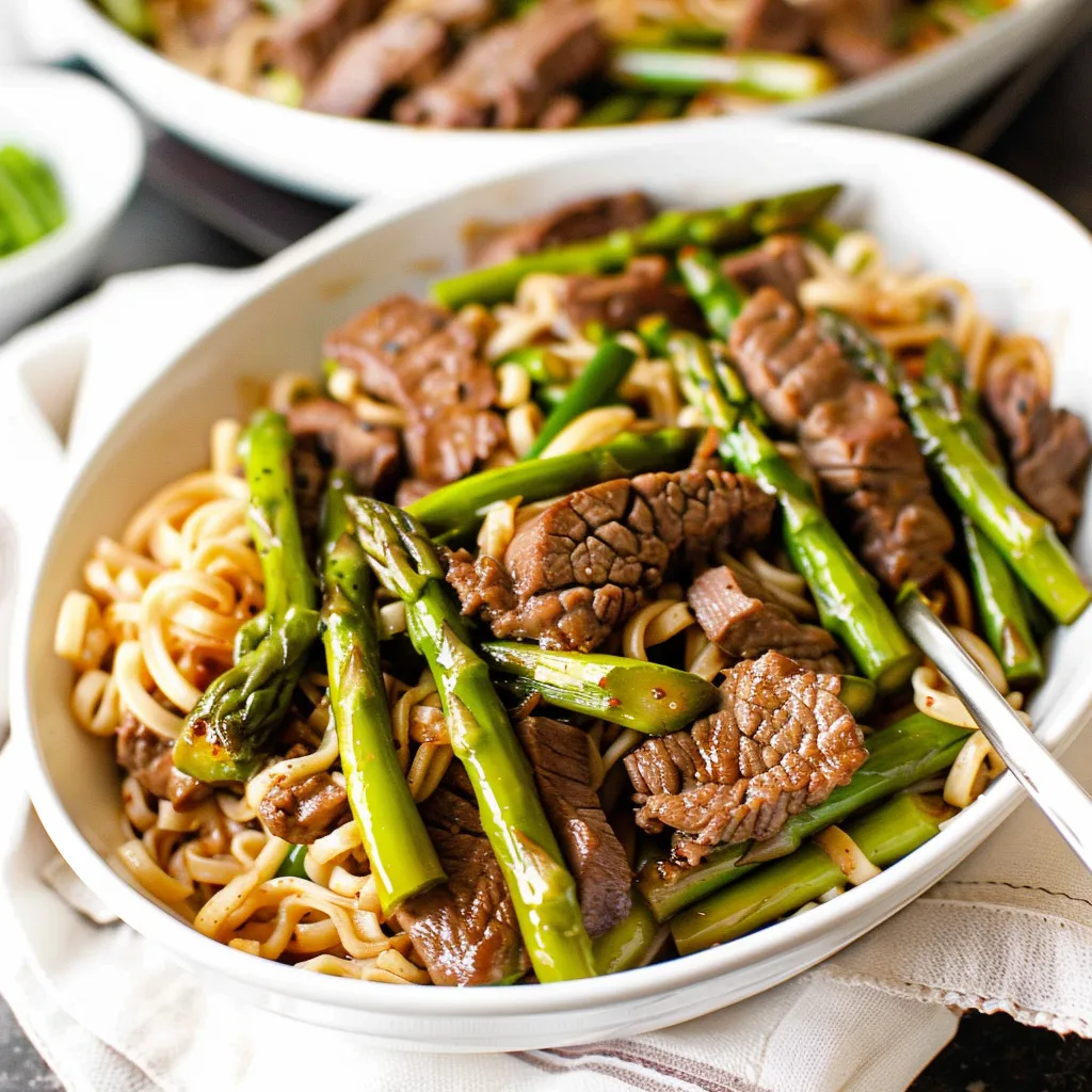 Savor the flavors of beef lo mein paired with fresh asparagus. A perfect recipe for a delightful dinner that will please your taste buds!