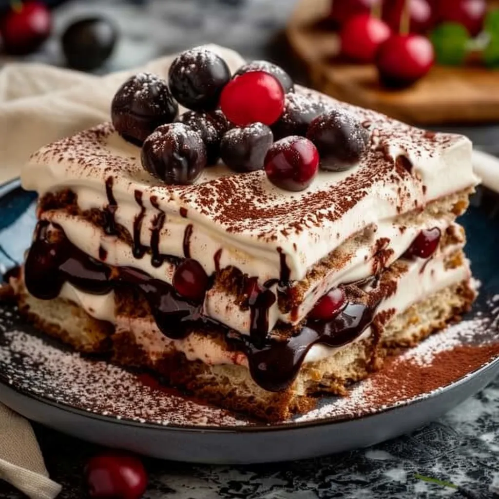 Indulge in decadent Black Forest Tiramisu Experience pure delight with layers of chocolate and cherries in this irresistible dessert