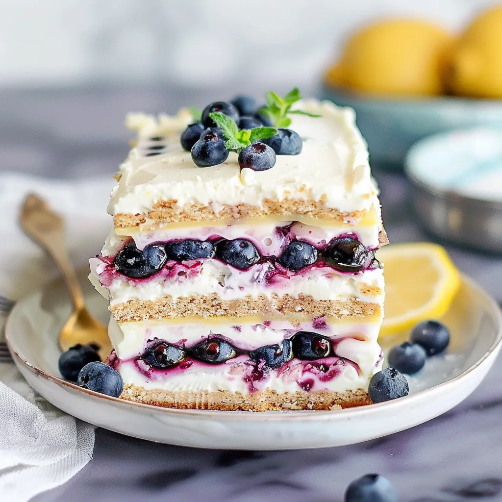 A refreshing Blueberry Lemon Icebox Cake featuring creamy layers of whipped goodness, tangy lemon, and sweet blueberries, perfect for summer gatherings.