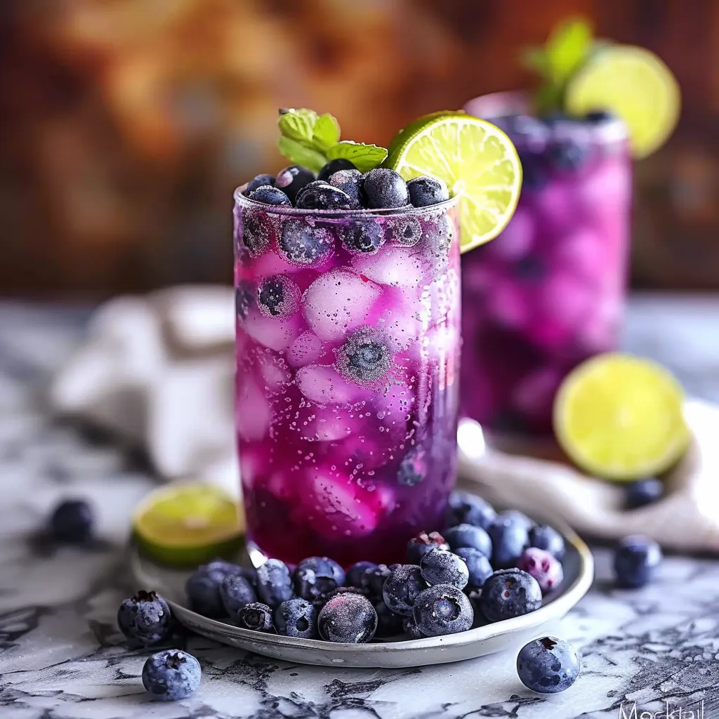 A refreshing non-alcoholic beverage that combines the sweetness of blueberries with the zing of lime, topped with sparkling water for a delightful summer drink.