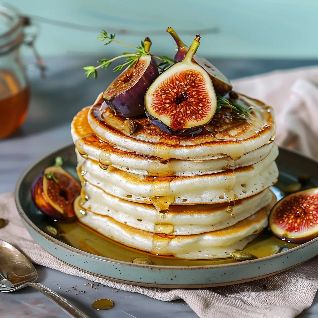 - Serve: Stack the pancakes on a plate, top with the honey-roasted figs, and drizzle any remaining honey over the top. Consider adding your choice of garnishes!