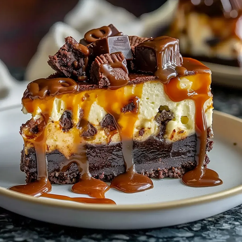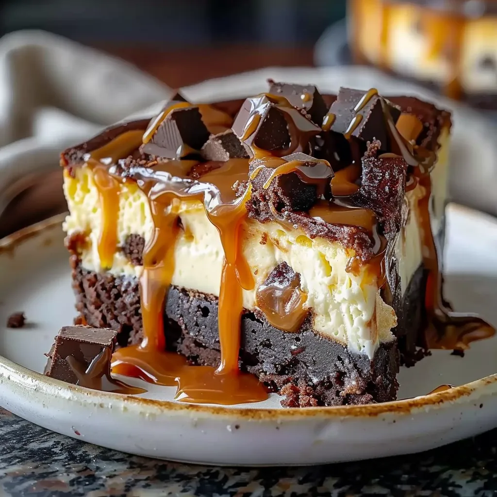 Picture this: a luscious cheesecake that melts in your mouth, complemented by a robust, chocolate brownie base, and finished with a silky caramel drizzle. Each forkful greets you with a delightful dance of flavors—the rich chocolate mingling with the creamy tang of cream cheese, all perfectly balanced by the sweetness of caramel. It’s like a comforting embrace from your favorite blanket after a chilly day, bringing you warmth and happiness with every bite.