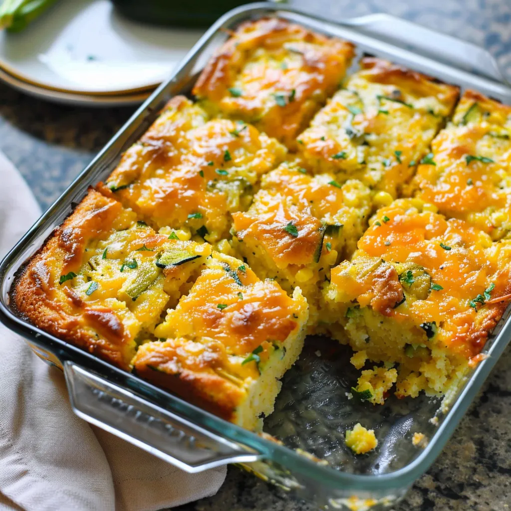 Experience this irresistible savory delight Cheesy Zucchini Cornbread Casserole combines flavors perfect for family dinners or potlucks Enjoy
