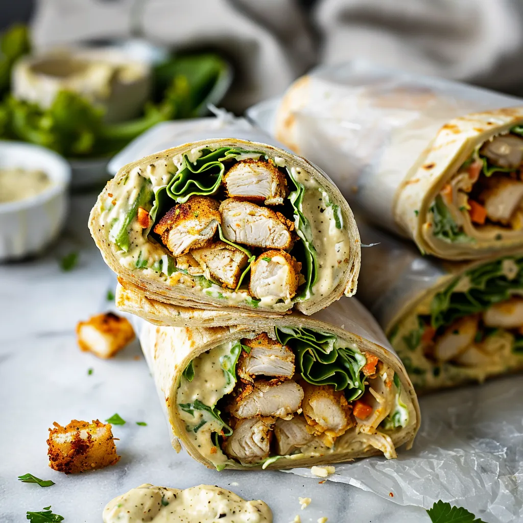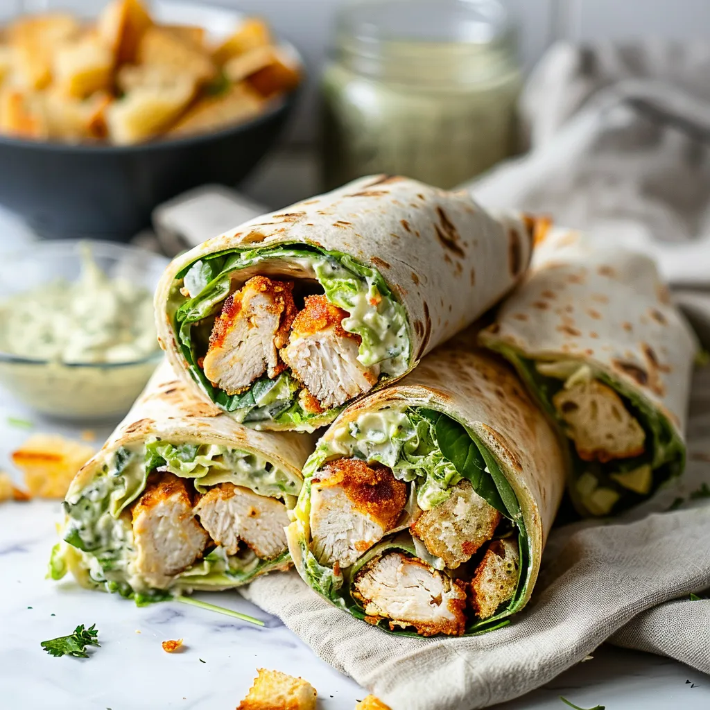 A delightful Chicken Caesar Wrap that combines succulent chicken, fresh romaine, and creamy Caesar dressing, perfect for a quick and tasty meal.