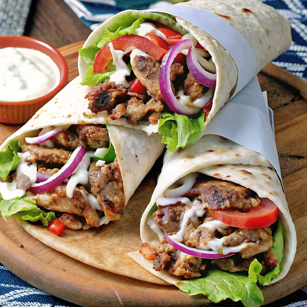 A delicious and comforting Chicken Shawarma with spiced chicken wrapped in pita, complemented by a smooth garlic sauce.