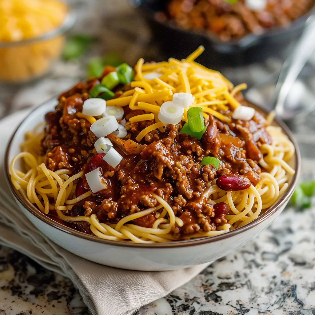 - Serve: Spoon the chili over the drained spaghetti, garnishing with shredded cheese and your chosen toppings. Enjoy hot!