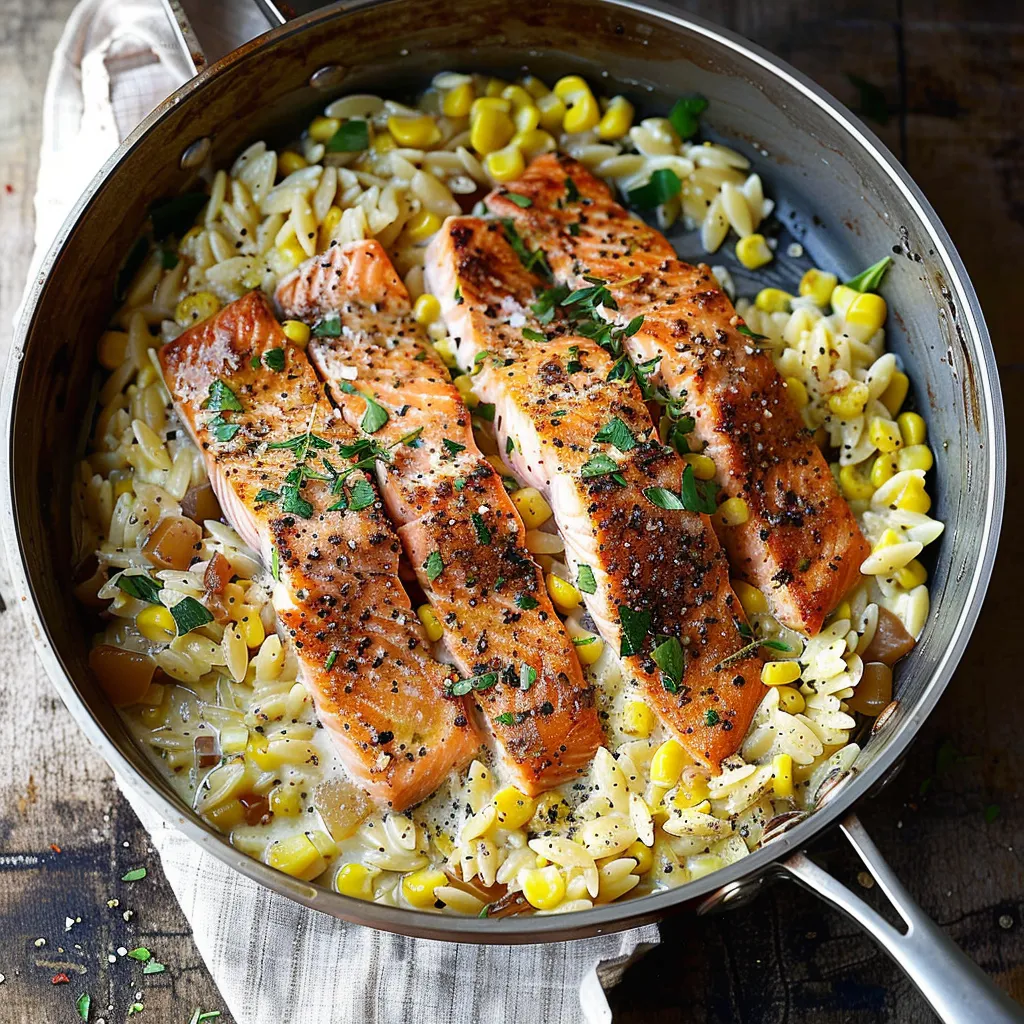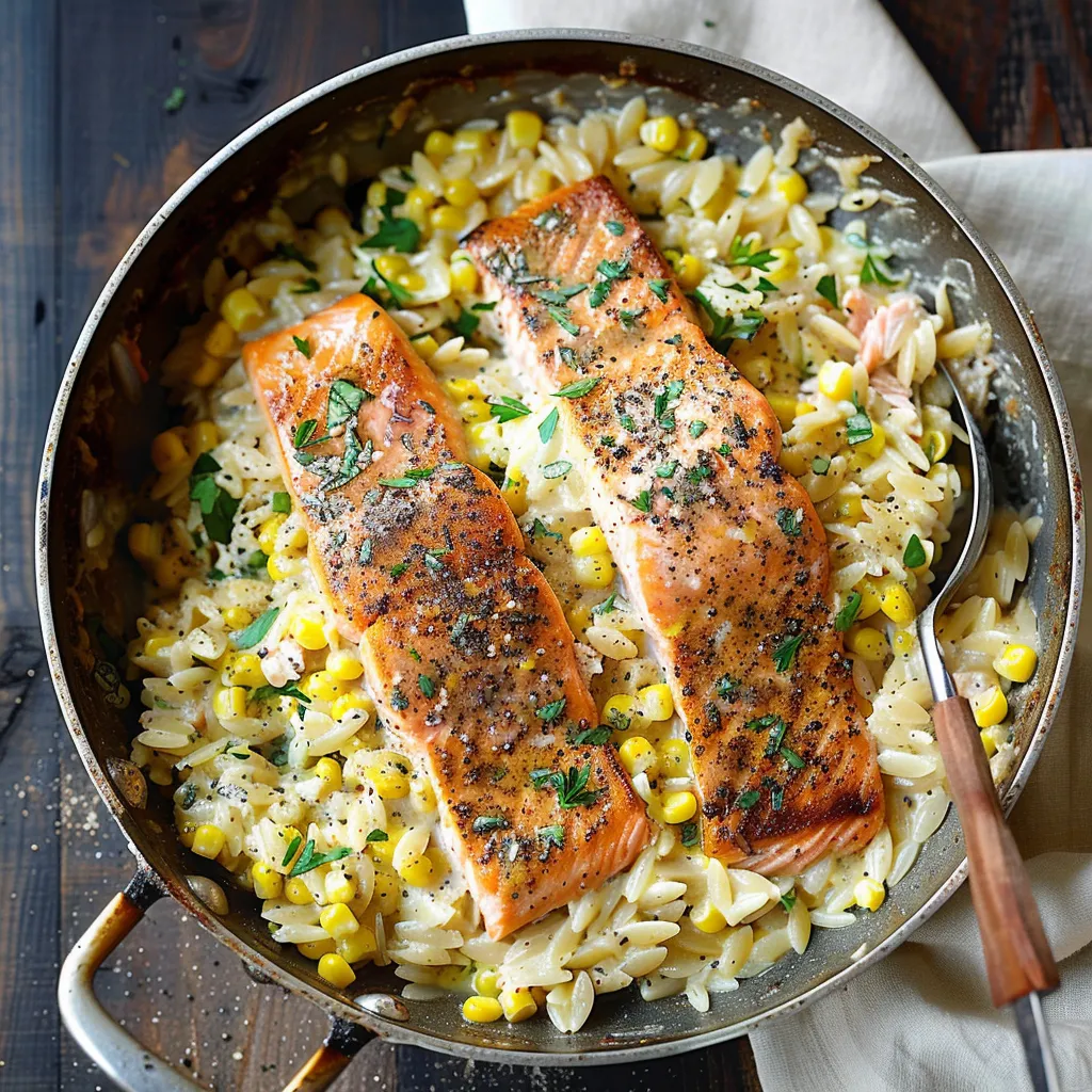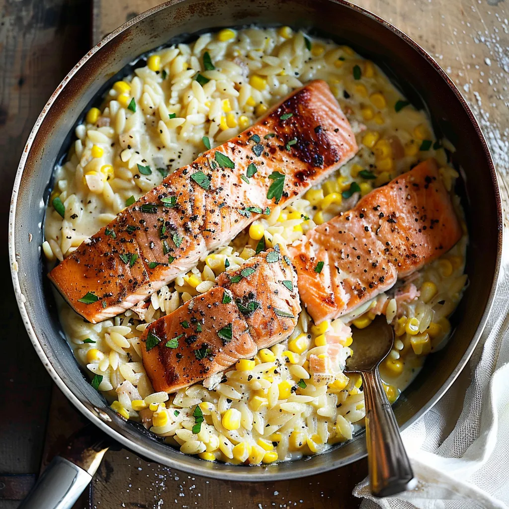 Delicious Creamed Corn Orzo with Salmon Recipe for Dinner