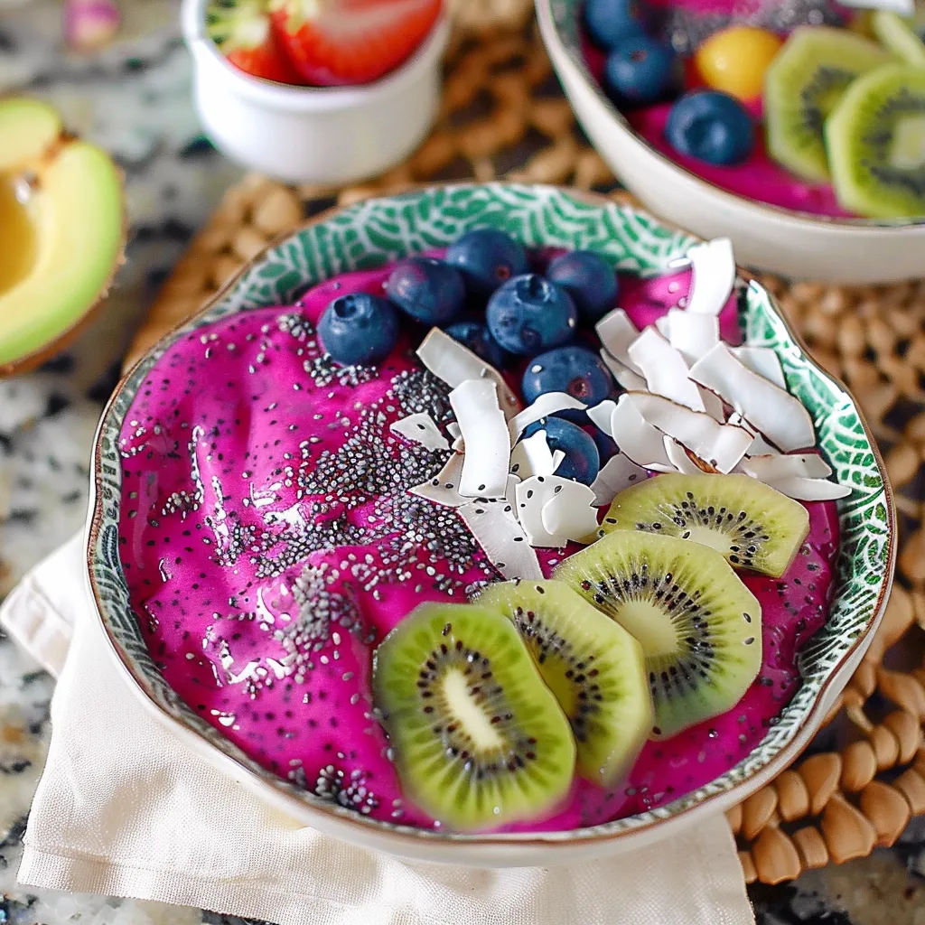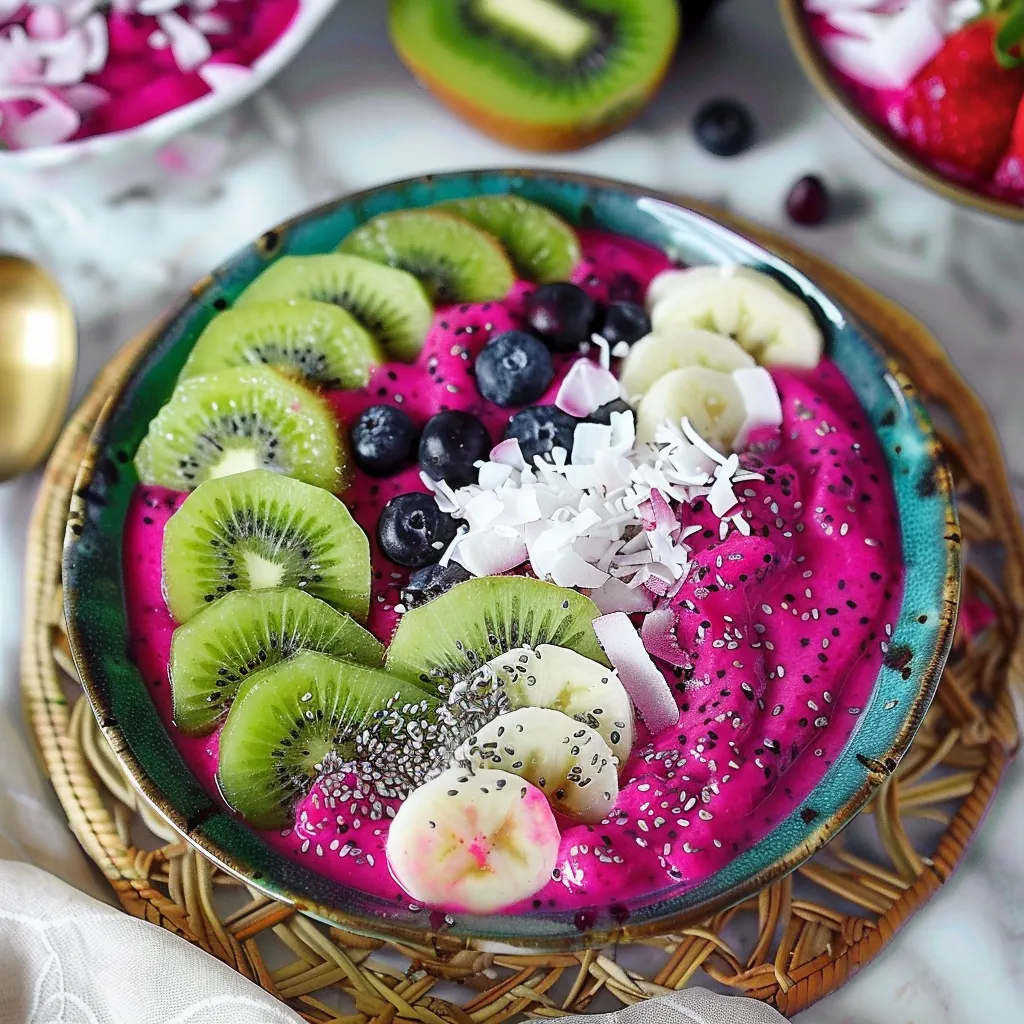 Savor vibrant Dragon Fruit Pitaya Bowls, beautifully topped with fresh kiwi and coconut. A colorful, nutritious treat bursting with flavor!
