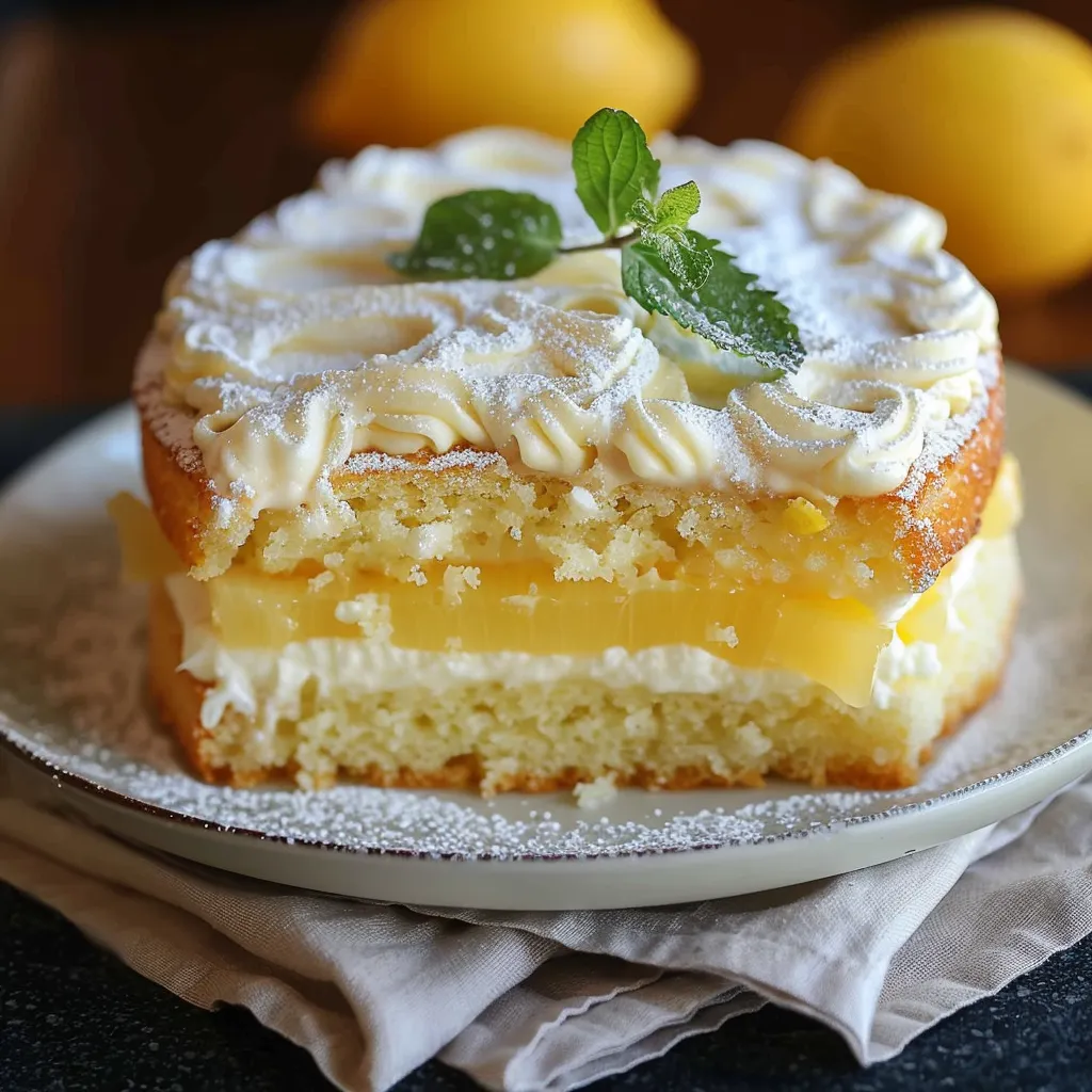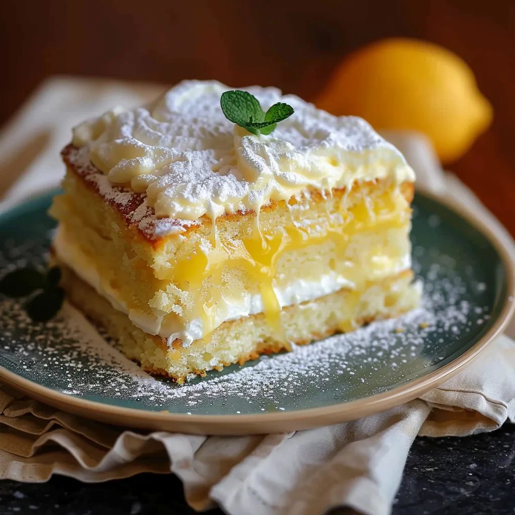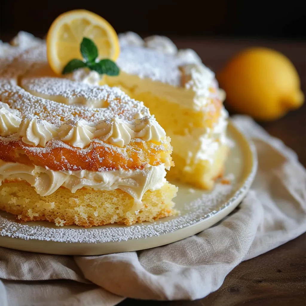 A delightful fluffy lemon cake that dances between sweet and tart, topped with whipped cream and powdered sugar, perfect for any occasion.