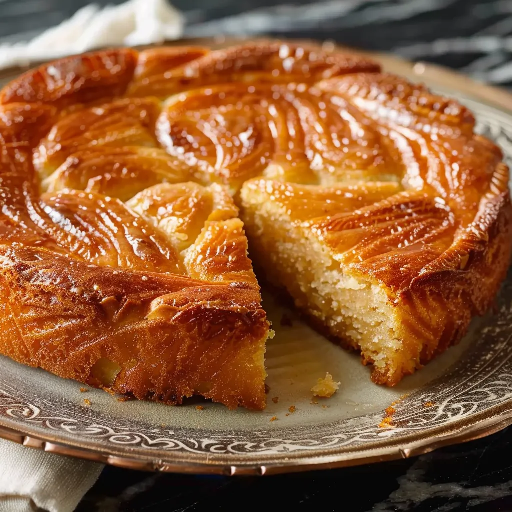A delightful French butter cake with a rich velvety texture and a golden crust, reminiscent of sunny afternoons spent with loved ones.