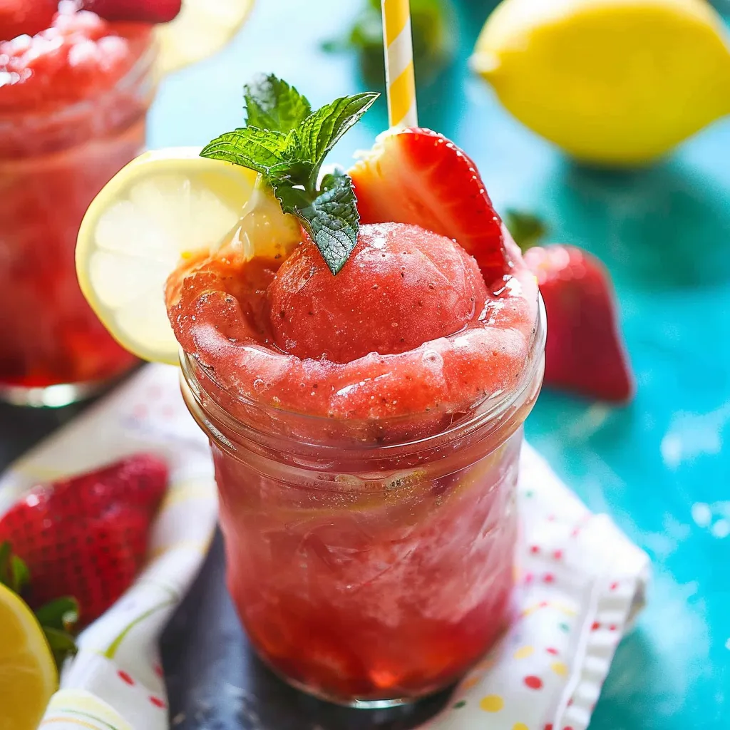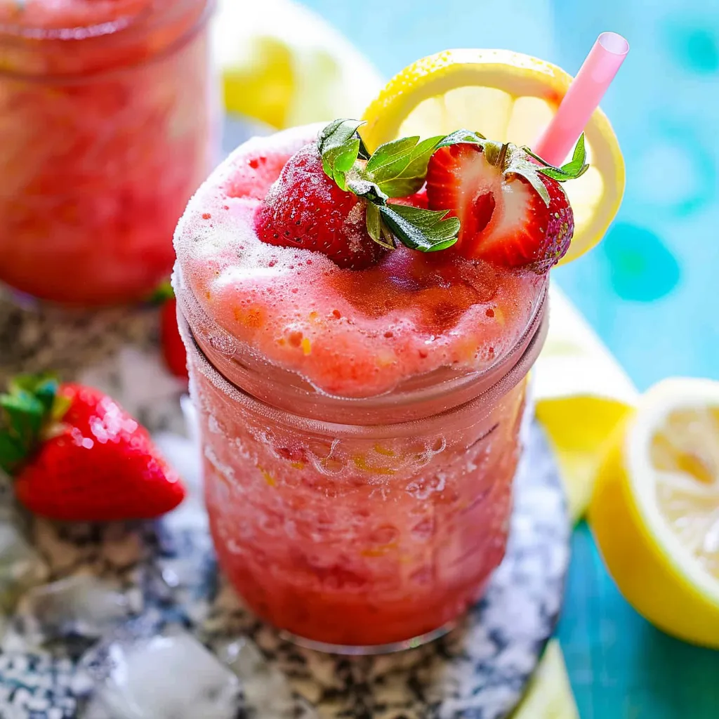 A refreshing frozen strawberry lemonade slushie perfect for hot summer days, combining sweet strawberries and zesty lemons in a delightful drink.