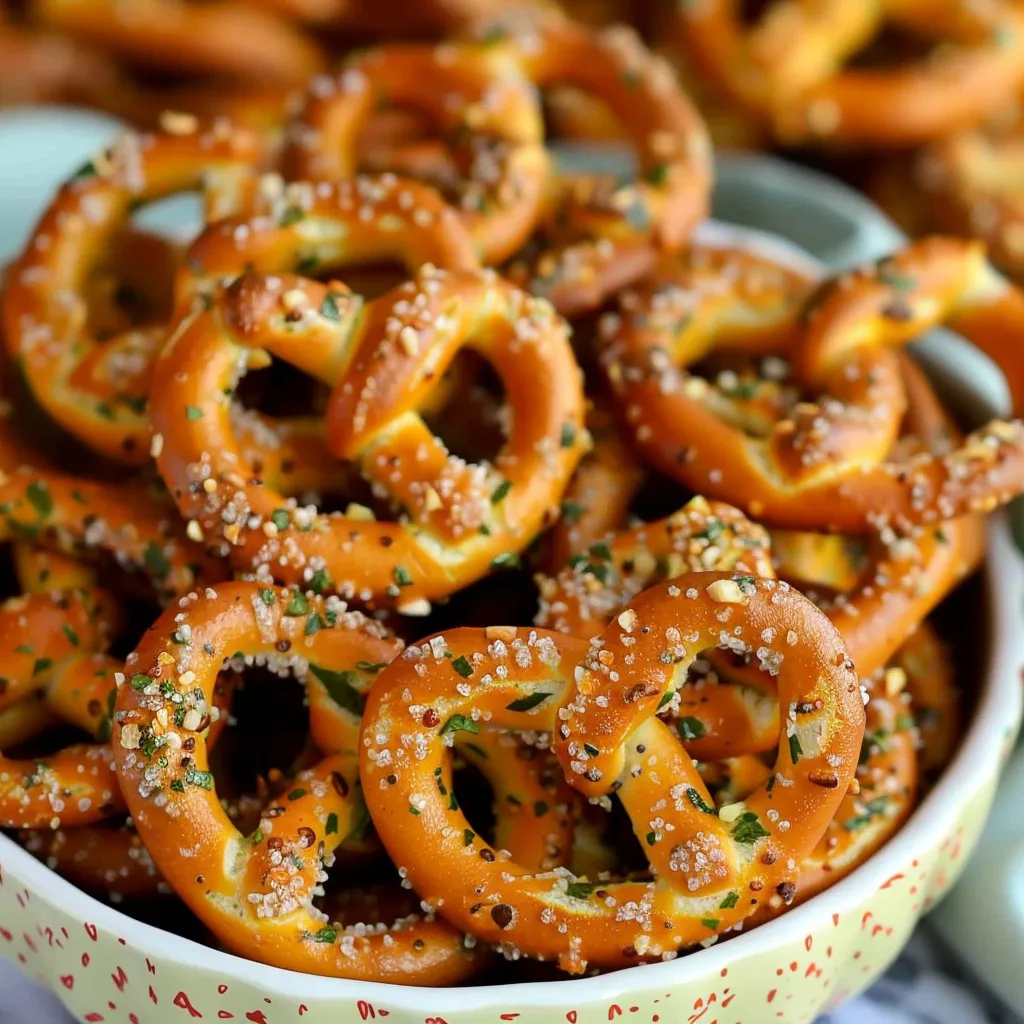 - Add the pretzels to the bowl and toss them gently until they are evenly coated with the seasoning mix.