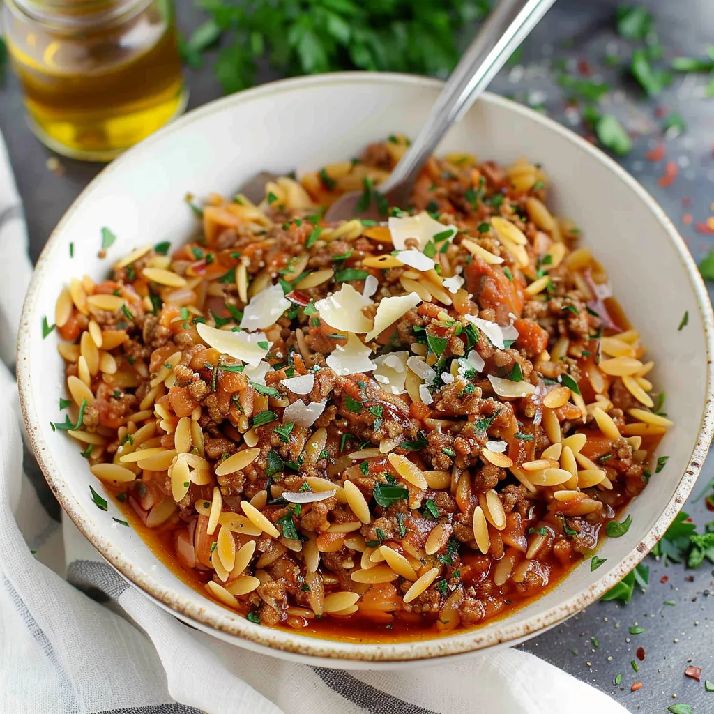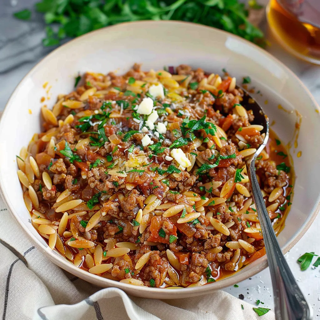 A comforting dish combining tender orzo, seasoned ground beef, and vibrant vegetables, perfect for cozy evenings.