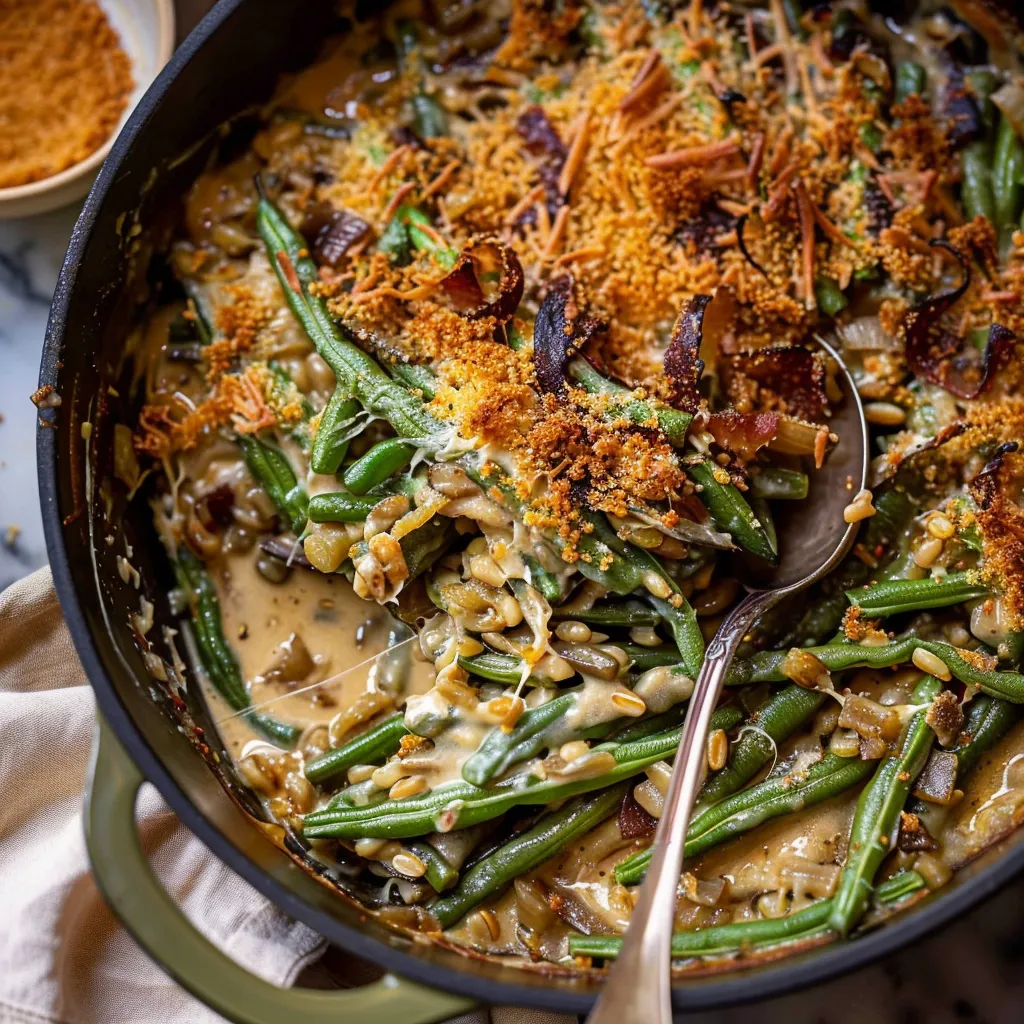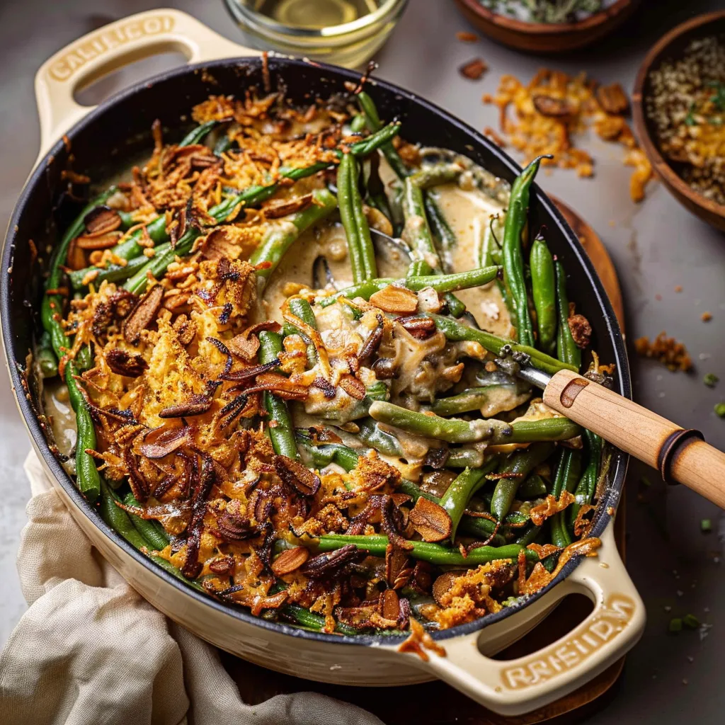 A comforting green bean casserole recipe that combines creamy goodness with crunchy toppings, perfect for family gatherings and holiday meals.