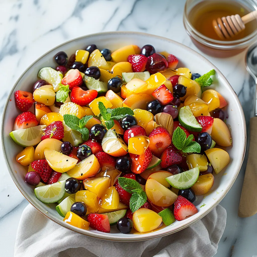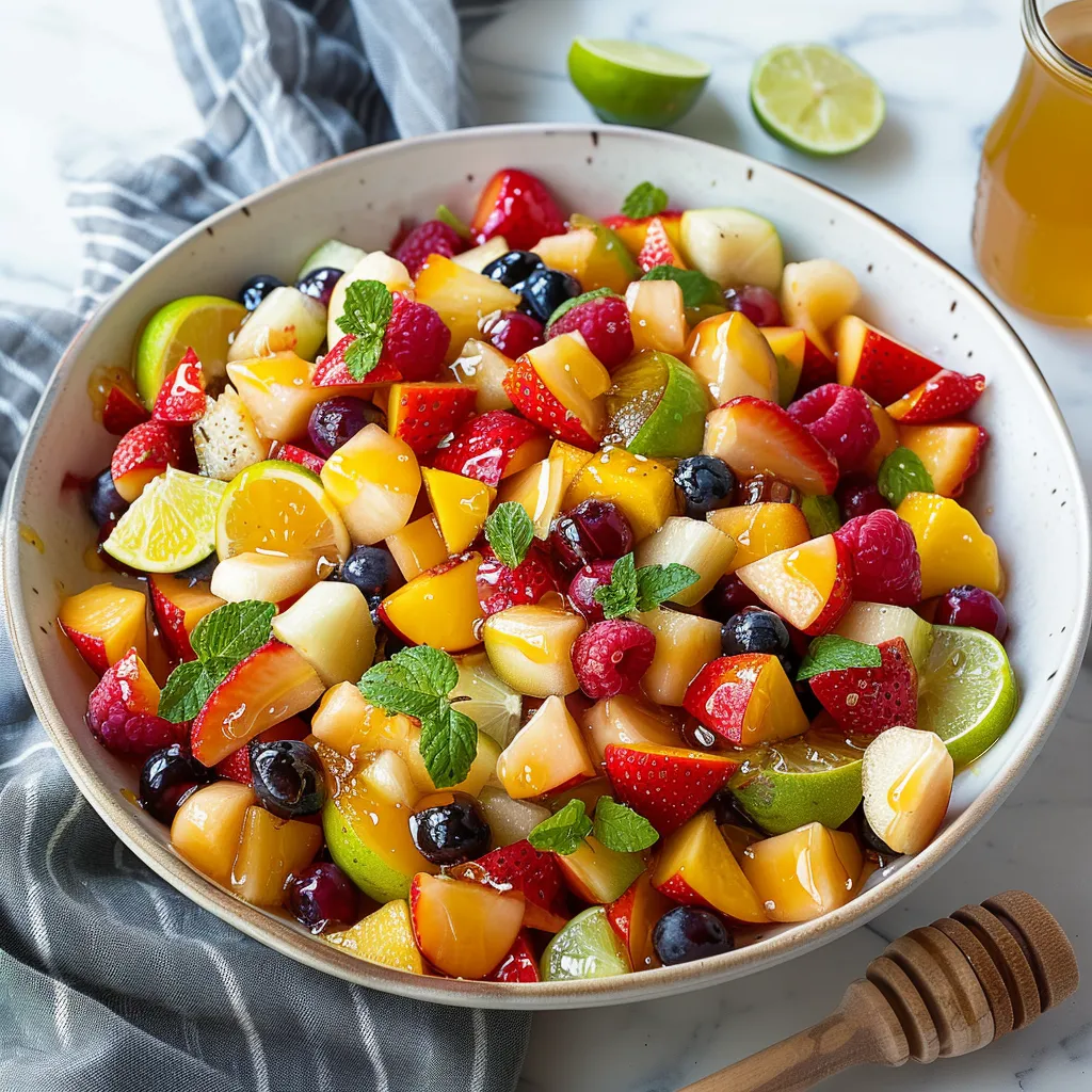 Discover a delicious honey-lime fruit salad featuring fresh mint leaves—perfect for a refreshing treat or side at any gathering. Taste the flavor!