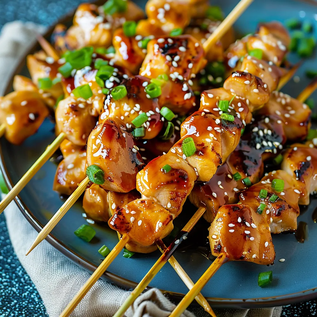 A delightful dish of grilled chicken skewers brushed with a sweet and savory glaze, reminiscent of evenings spent at yakitori stalls in Tokyo.