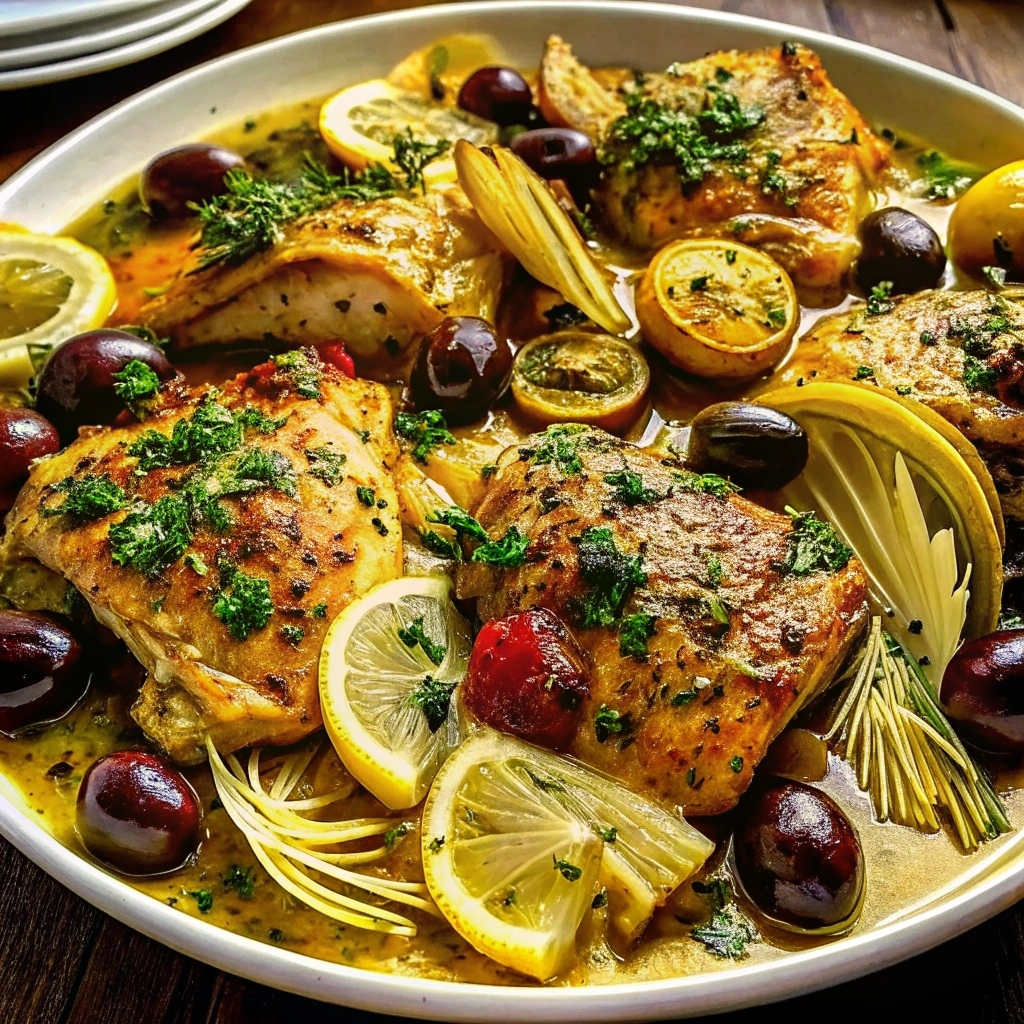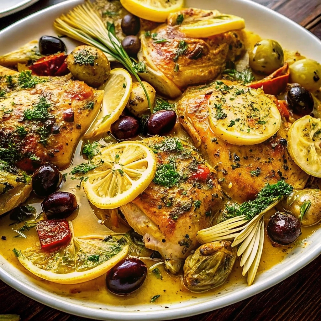 Savor zesty Mediterranean lemon chicken paired with artichokes olives for a delicious meal Discover this mouthwatering recipe today