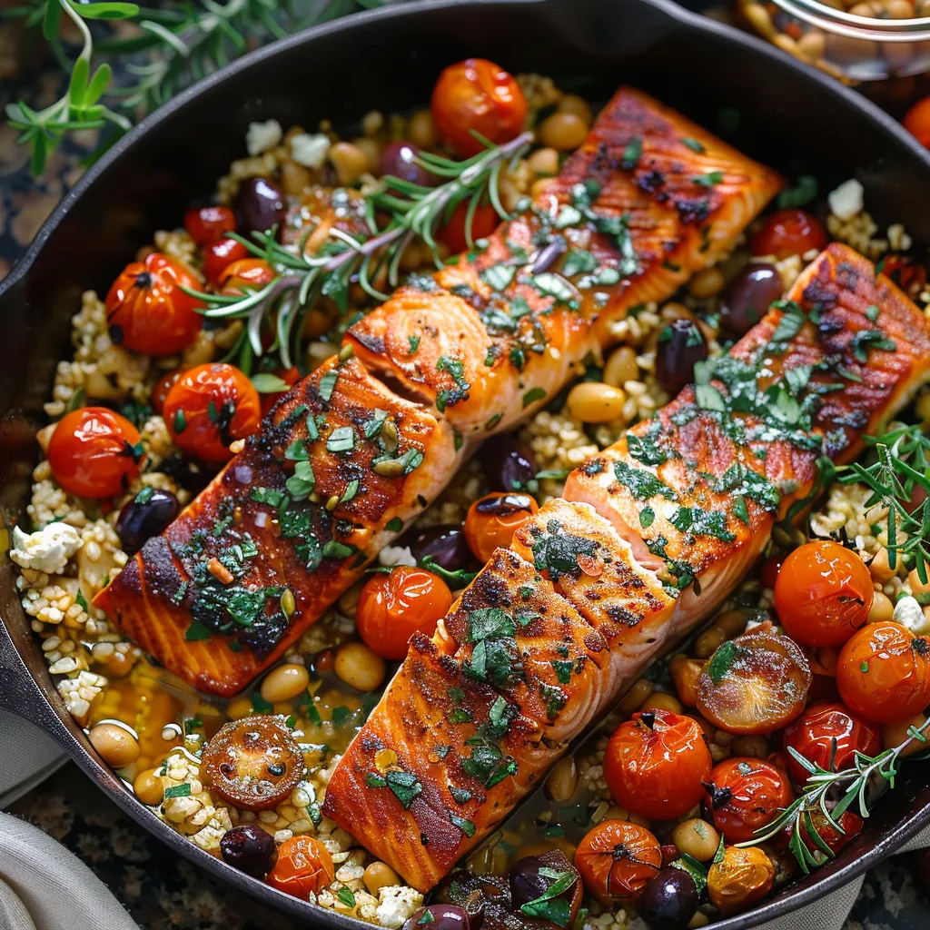 A delightful one-pan meal that combines tender salmon with sun-kissed olives, vibrant tomatoes, and fresh herbs, all bringing a taste of the Mediterranean to your dinner table.
