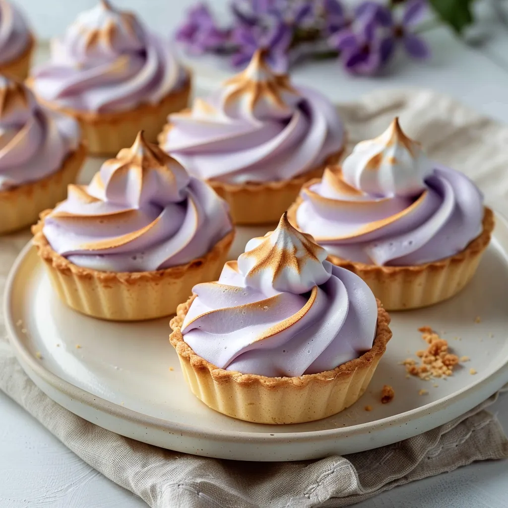 Savor these mini lemon tarts topped with lilac meringue—perfectly sweet and tangy for any dessert lover. A delightful treat for your palate!