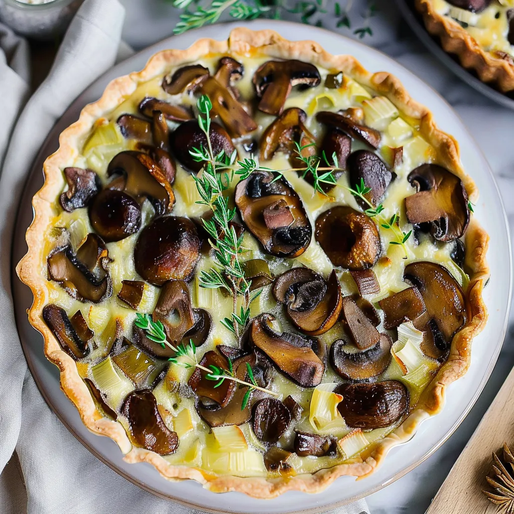 A comforting Mixed Mushroom and Leek Tart that combines earthy mushrooms and sweet leeks in a flaky pastry, evoking nostalgia and warmth for family gatherings.