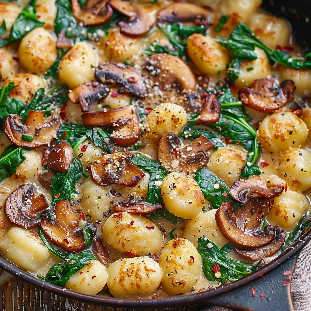 Imagine sinking your teeth into pillowy gnocchi that offers a soft, satisfying bite, surrounded by the umami richness of sautéed mushrooms. The spinach contributes a subtle earthiness and a pop of color, while garlic adds a fragrant depth to the dish. The harmonious blend of flavors results in a creamy, savory experience that lingers long after the plate is cleared, making each serving a comforting delight for your taste buds.