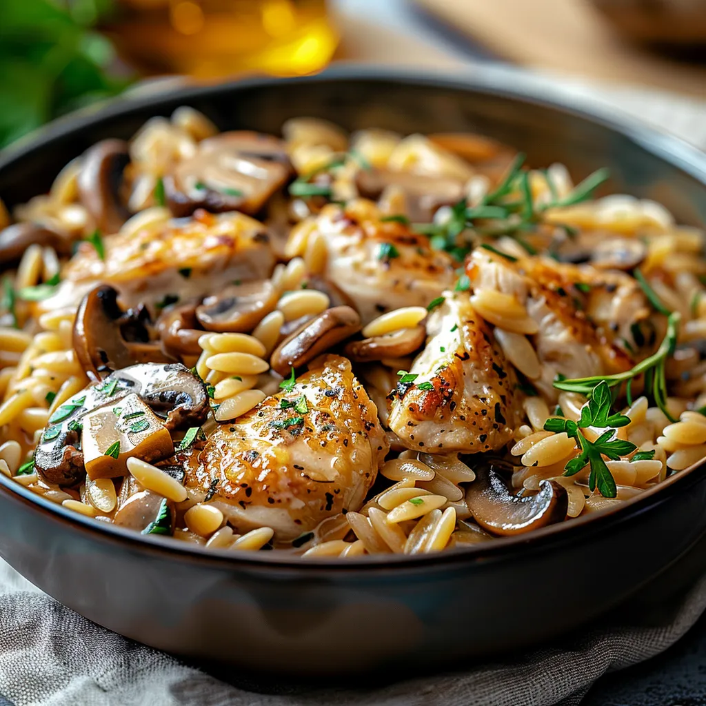 Easy quick savory one pot chicken mushroom orzo recipe Flavorful creamy dish perfect for weeknight dinners All in one pot 154 chars