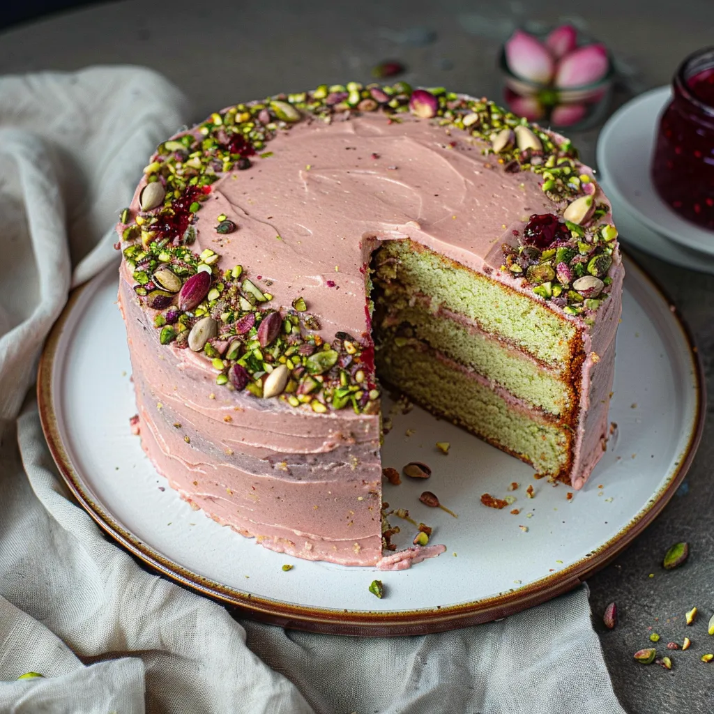 A fragrant and colorful cake that melds the floral essence of rose with the warmth of cardamom and the crunch of pistachios, perfect for any occasion.