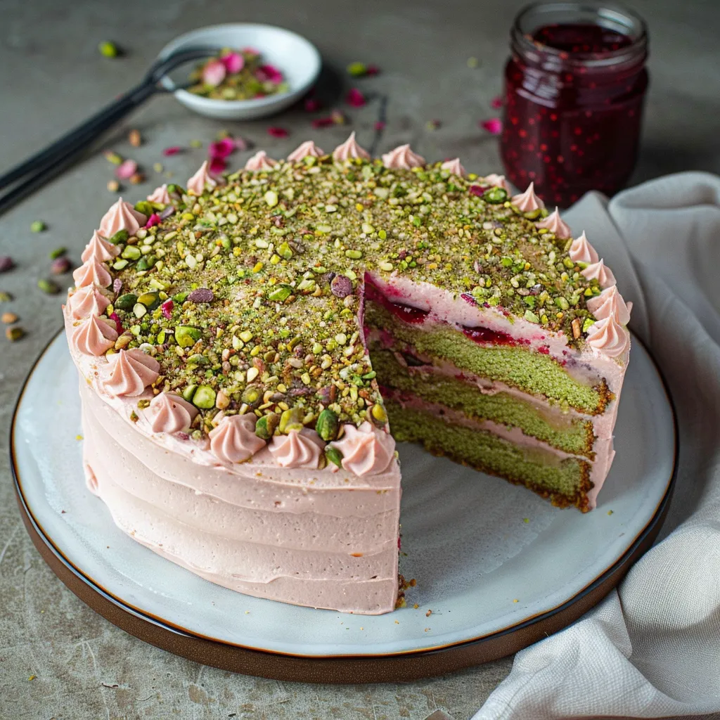 Savor the rich flavors of pistachio, cardamom, and raspberry in this exquisite cake recipe. Perfect for any celebration or a sweet treat!