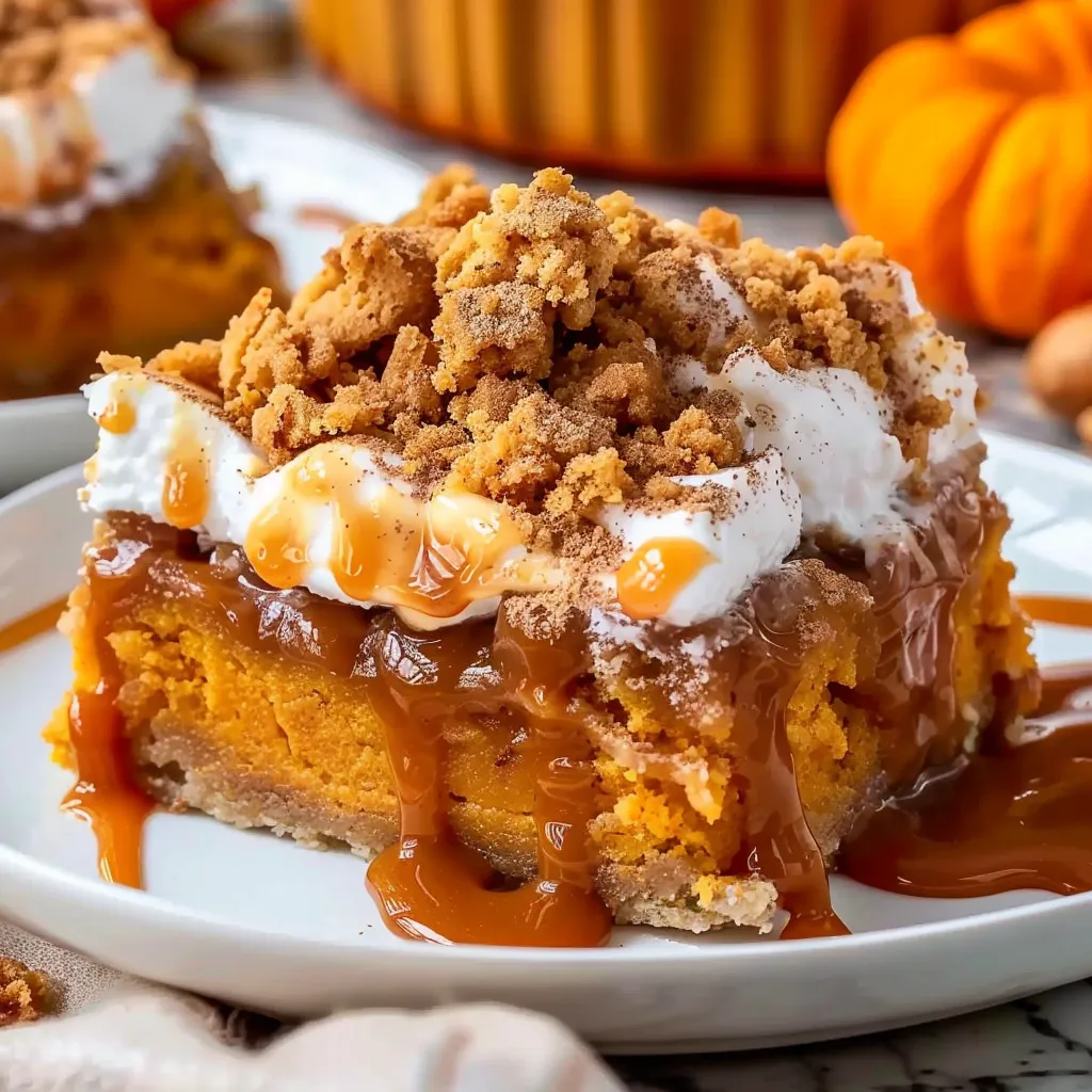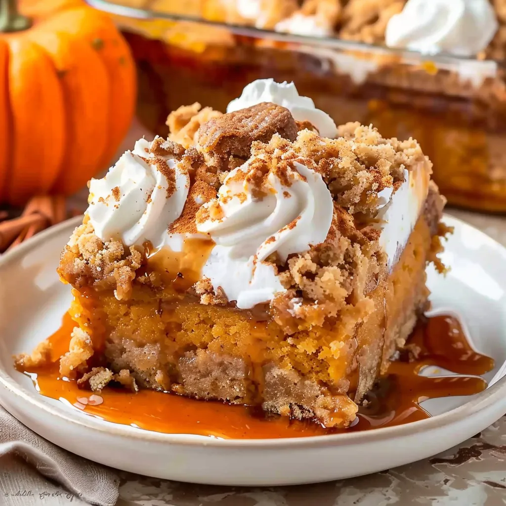 This cake brings together the rich, warm flavors of pumpkin and spices that evoke the essence of fall. Picture the creamy pumpkin filling infused with notes of cinnamon, nutmeg, and ginger, layered under a crumbly, golden topping made from spice cake mix. Each bite is a cozy hug that stirs nostalgic feelings of chilly evenings and holiday cheer. The texture balances between cake and pie, making every piece a perfectly satisfying treat.