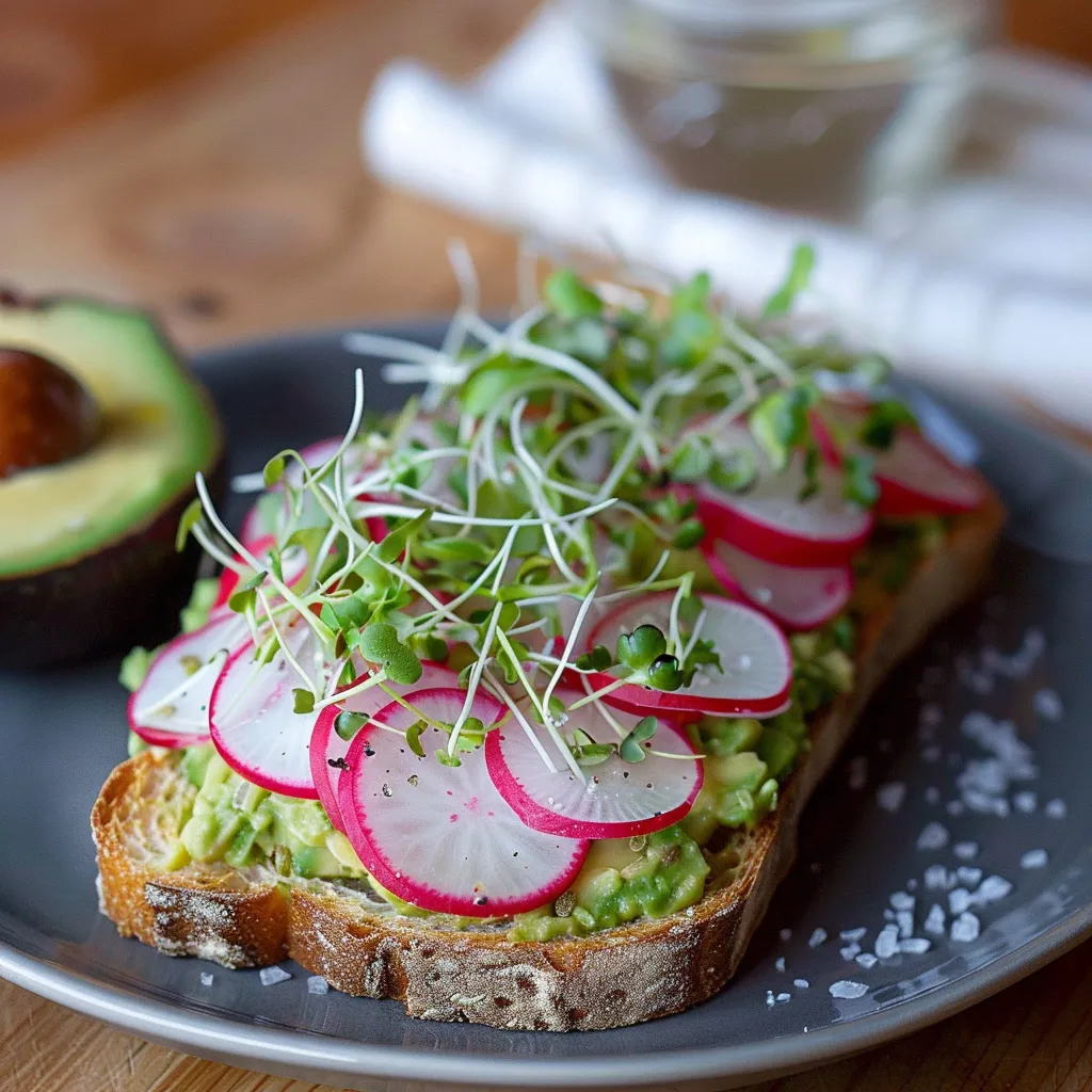 Savor radish & avocado toast topped with microgreens and sea salt. A fresh, vibrant dish perfect for breakfast or a light snack. Enjoy this recipe!