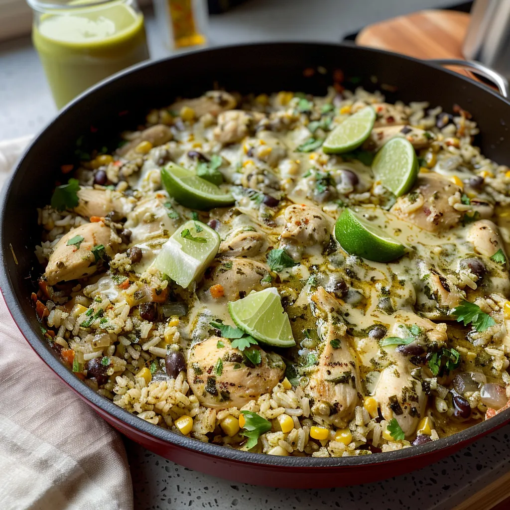 Quick delicious Salsa Verde chicken rice skillet recipe perfect for busy weeknights Enjoy bold flavors minimal prep time Ready fast 154 chars