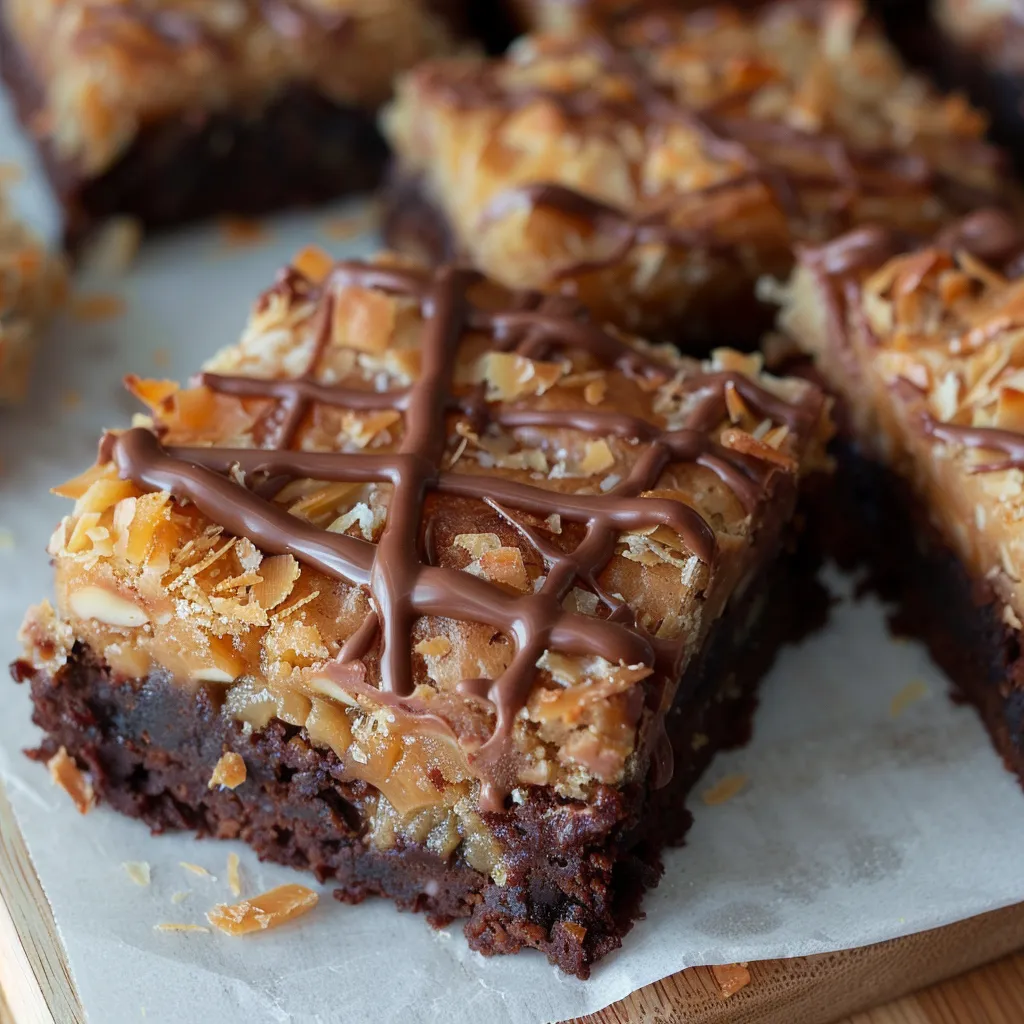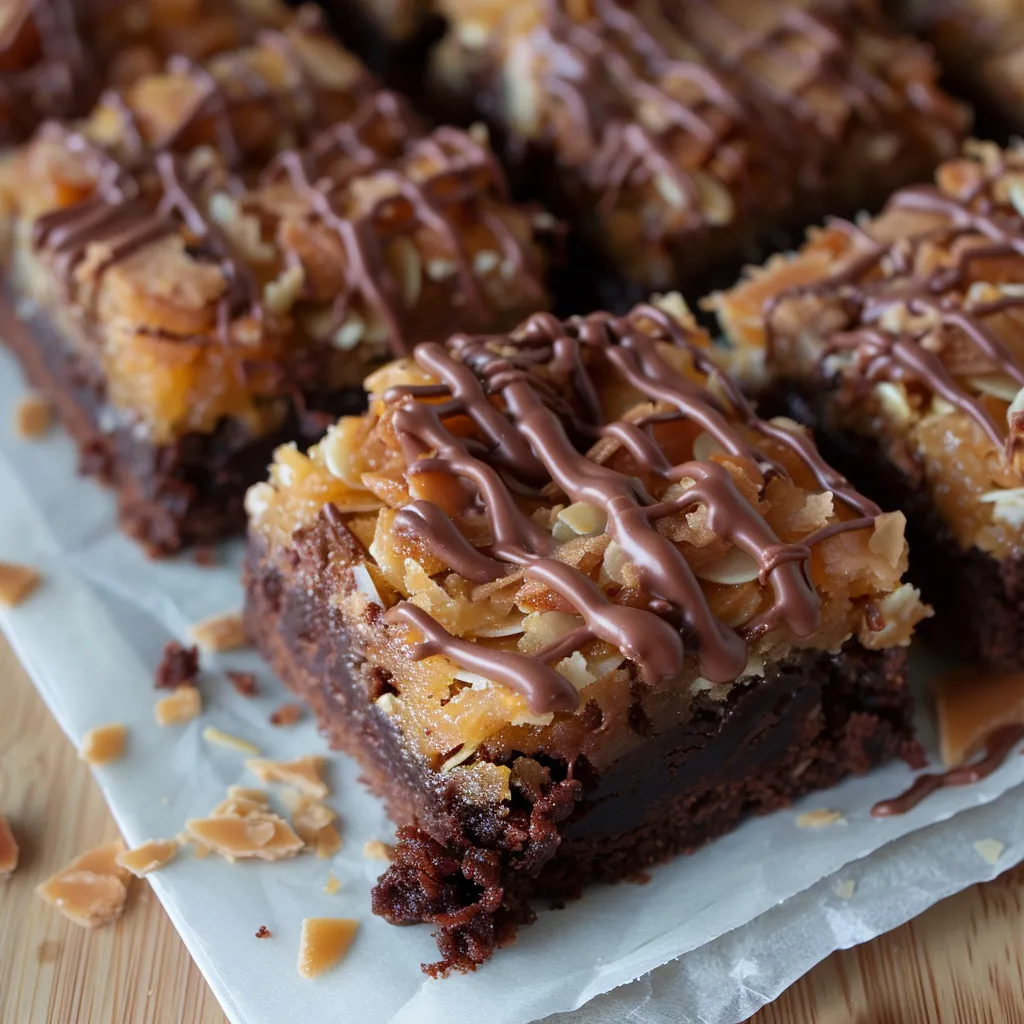 Samoa Brownies are a delicious dessert that combines chewy brownie, creamy caramel, and crunchy coconut, reminiscent of the classic Girl Scout Samoa cookie.