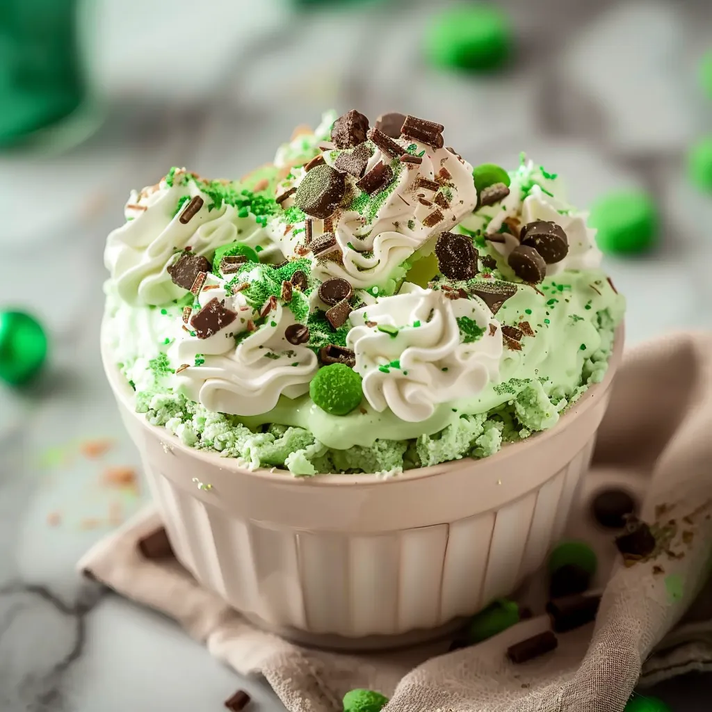 A delightful Shamrock Cheesecake Fluff that combines creamy cheesecake flavors with a splash of mint and a vibrant green hue, perfect for spring celebrations.