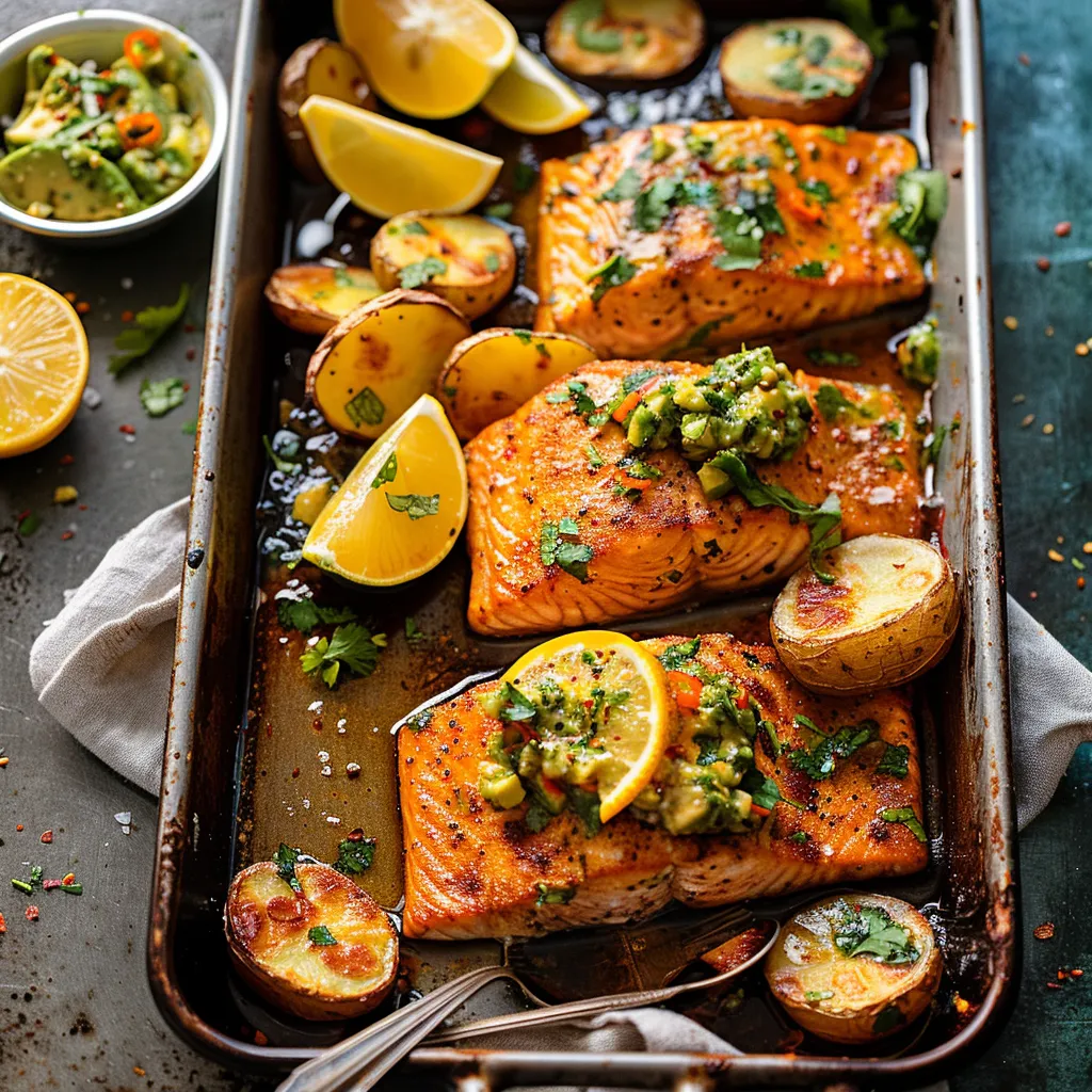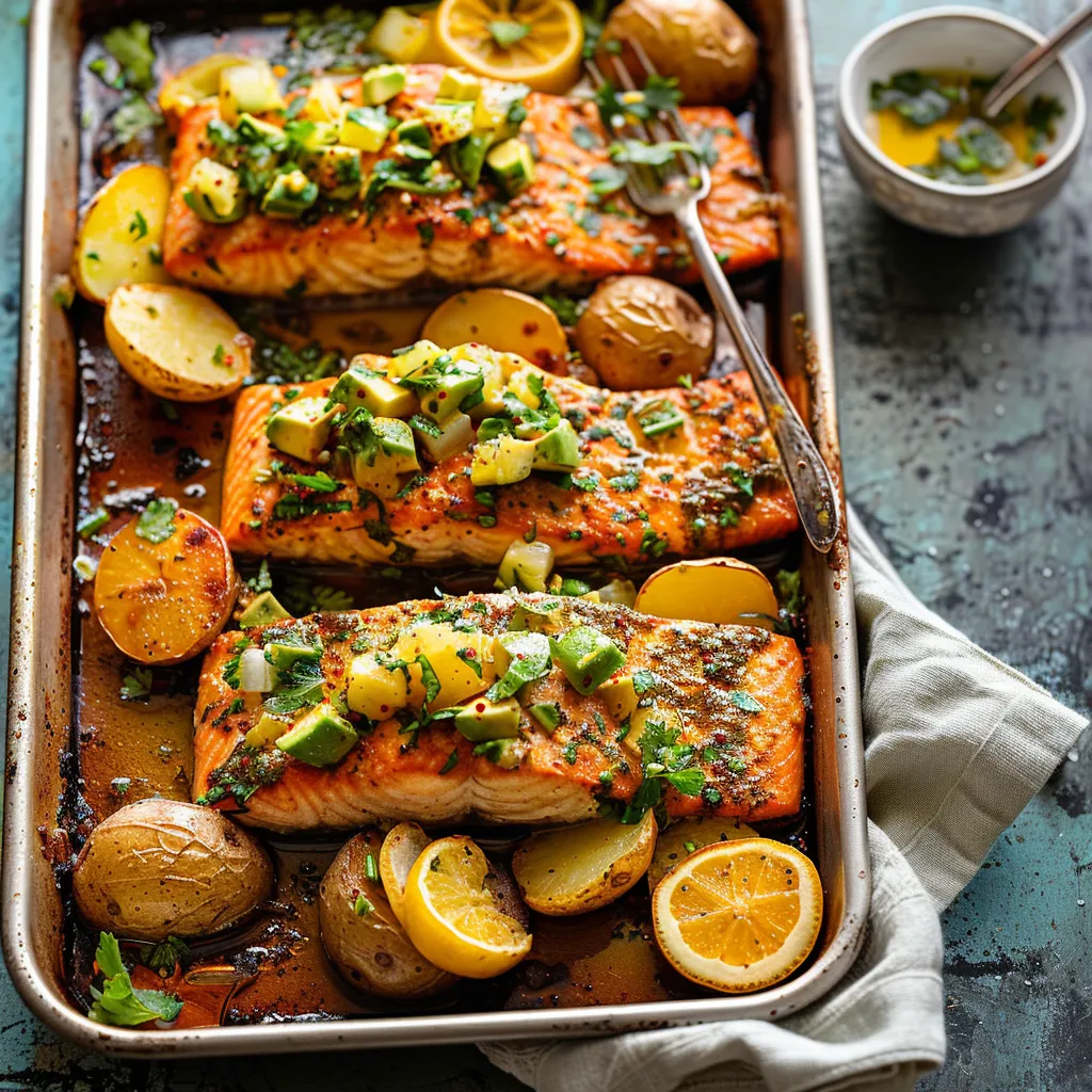 This recipe is incredibly versatile! Swap the salmon with your favorite protein—chicken thighs work wonderfully and can soak up all those glorious flavors just as well. If you want to lighten it up, use zucchini or bell peppers alongside the potatoes. The citrus avocado salsa is flexible, too—add diced mango for a sweet twist or some diced jalapeño for heat. And if you’re feeling adventurous, try swapping out the lime with grapefruit juice—it’s a surprising alternative that adds a delightful tartness.