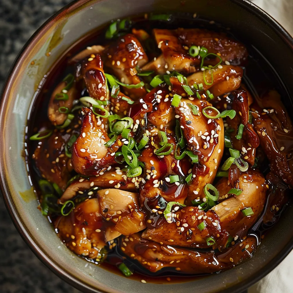- Serve: Once cooked, shred the chicken using two forks and return it to the sauce. Mix well and serve over rice, garnishing with sesame seeds and green onions.