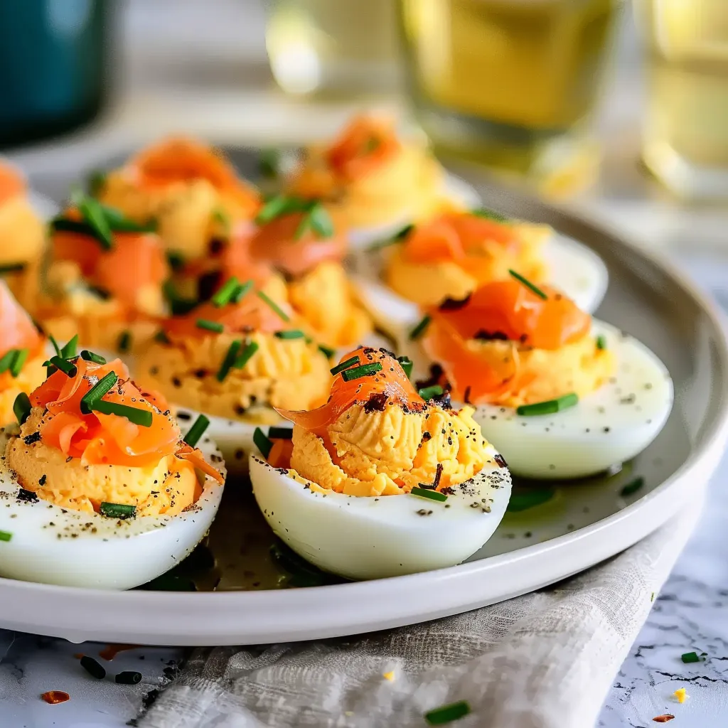 Delightful Smoked Salmon Chive Devilled Eggs that combine creamy egg yolks with rich smoked salmon and fresh chives for a sophisticated twist on a classic appetizer.