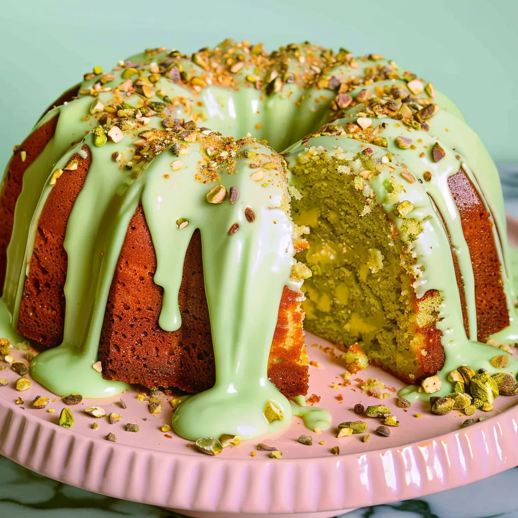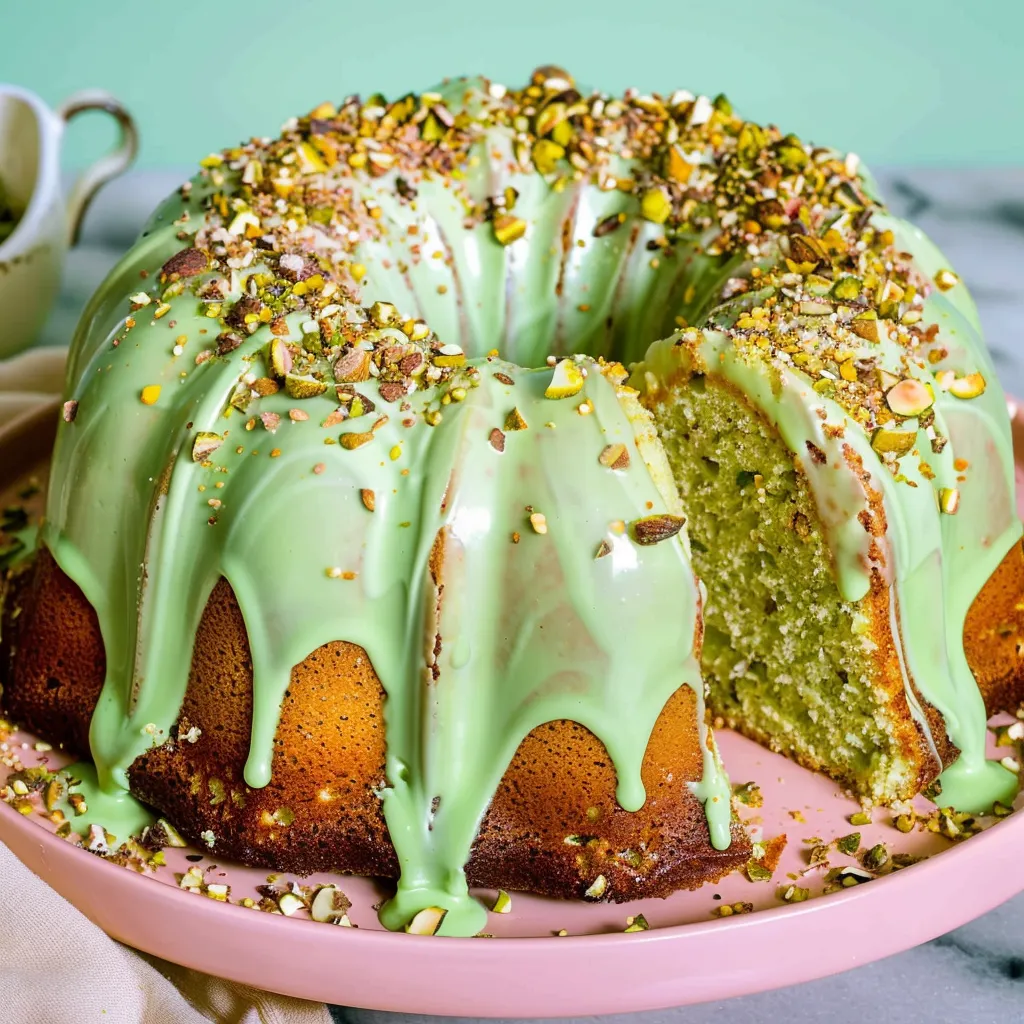 Imagine cutting into this luscious Bundt and being enveloped by the soft, nutty scent of roasted pistachios. The first slice reveals a bright green interior that’s almost too lovely to eat — it’s like spring on a plate! Each bite is a perfect balance of tender crumbs and slight crunch, with a delicate sweetness that dances on your tongue. The natural earthiness of the pistachios pairs beautifully with the light almond flavor, creating a symphony of tastes that remind you of sunlit picnics and long walks through blooming gardens. It’s comforting without being too heavy. A slice of this cake is like a warm hug after a long day.