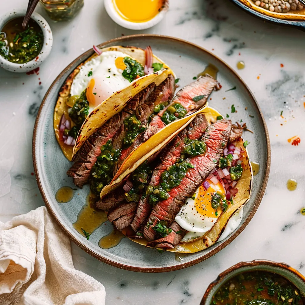 Savory steak and egg breakfast tacos topped with zesty chimichurri sauce for a satisfying morning meal. Perfect for brunch or breakfast lovers!