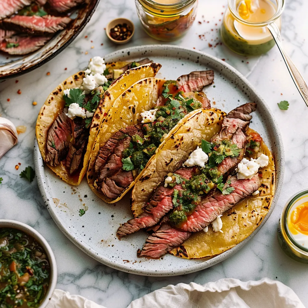 A delicious recipe for breakfast tacos filled with juicy steak, creamy scrambled eggs, and vibrant chimichurri sauce. Perfect for lazy weekends or brunch gatherings!