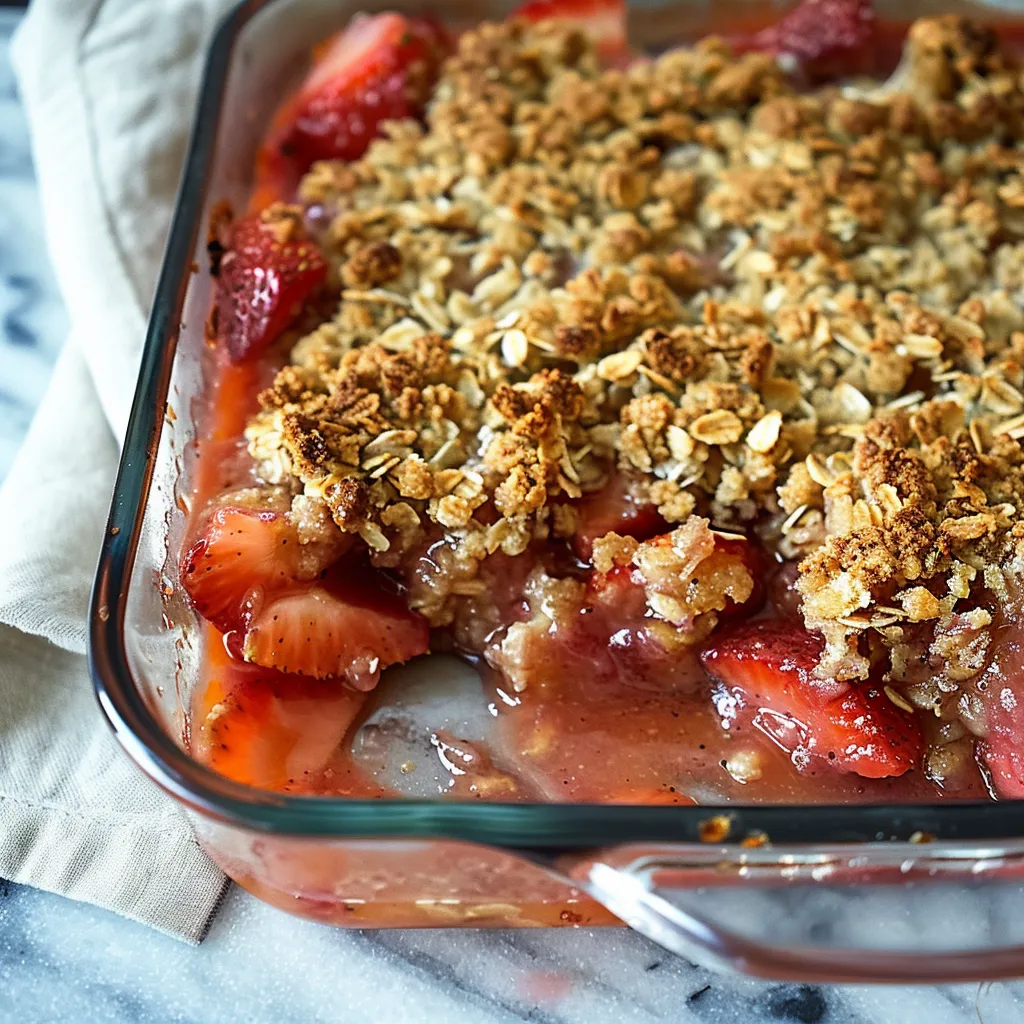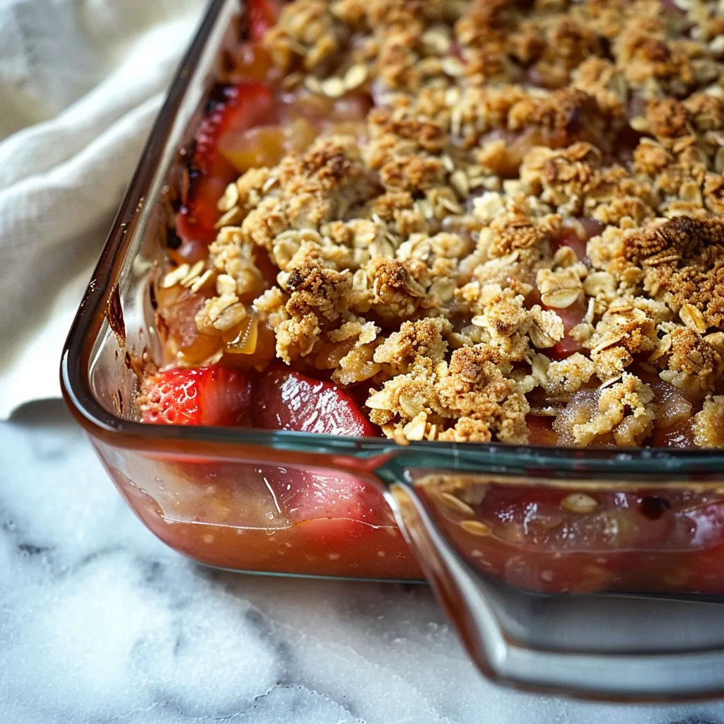 Imagine a warm hug wrapped in a crisp golden topping, with juicy strawberries and tangy rhubarb bursting with flavor beneath. The balance of sweet and tart dances on your tongue, creating a symphony of sensations that feels like that first warm bite of comfort after a long day. The oatmeal topping adds a rustic chewiness, contrasting beautifully with the tender fruit filling. Each spoonful is a reminder that simple can be astounding, reminiscent of lazy summer evenings spent outdoors, or cozy nights snuggled on the couch watching the stars twinkle through your window.