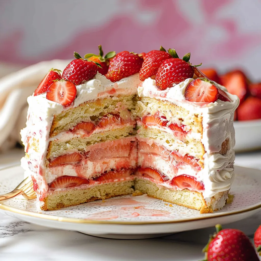 A delightful layered cake that combines soft, buttery cake with fresh strawberries and whipped cream, perfect for summer gatherings.