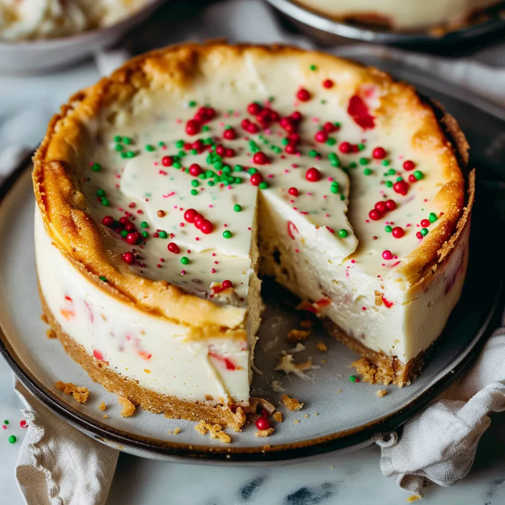 Indulge in a creamy cheesecake topped with sugar cookie crust perfect for satisfying your sweet tooth Try this delightful dessert today