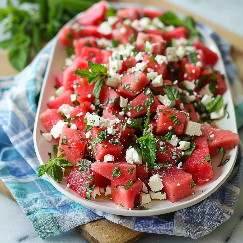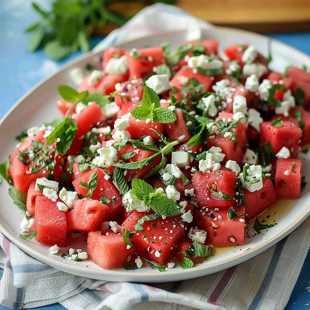 A refreshing Watermelon & Feta Salad with a hint of mint, perfect for summer gatherings and picnics.