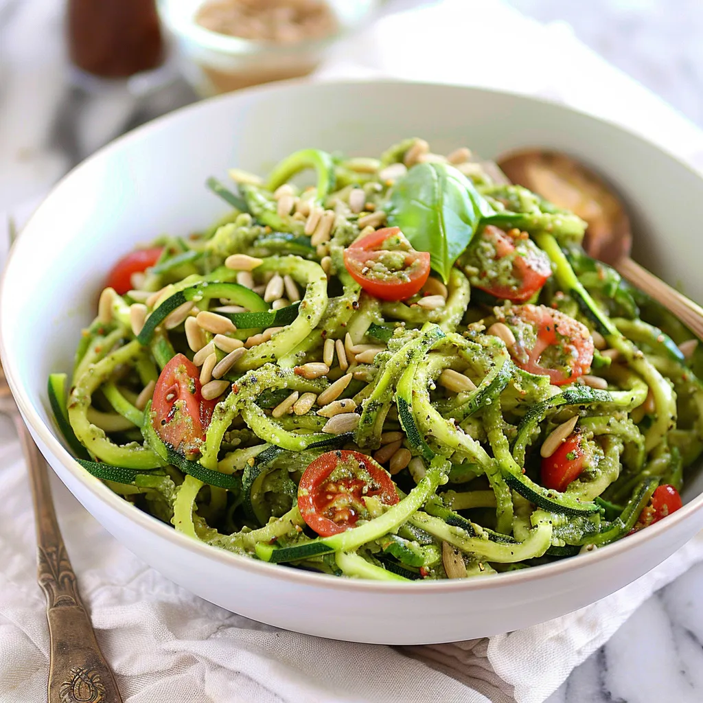 A delightful recipe for zucchini noodles tossed in creamy sunflower seed pesto, perfect for light summer meals.