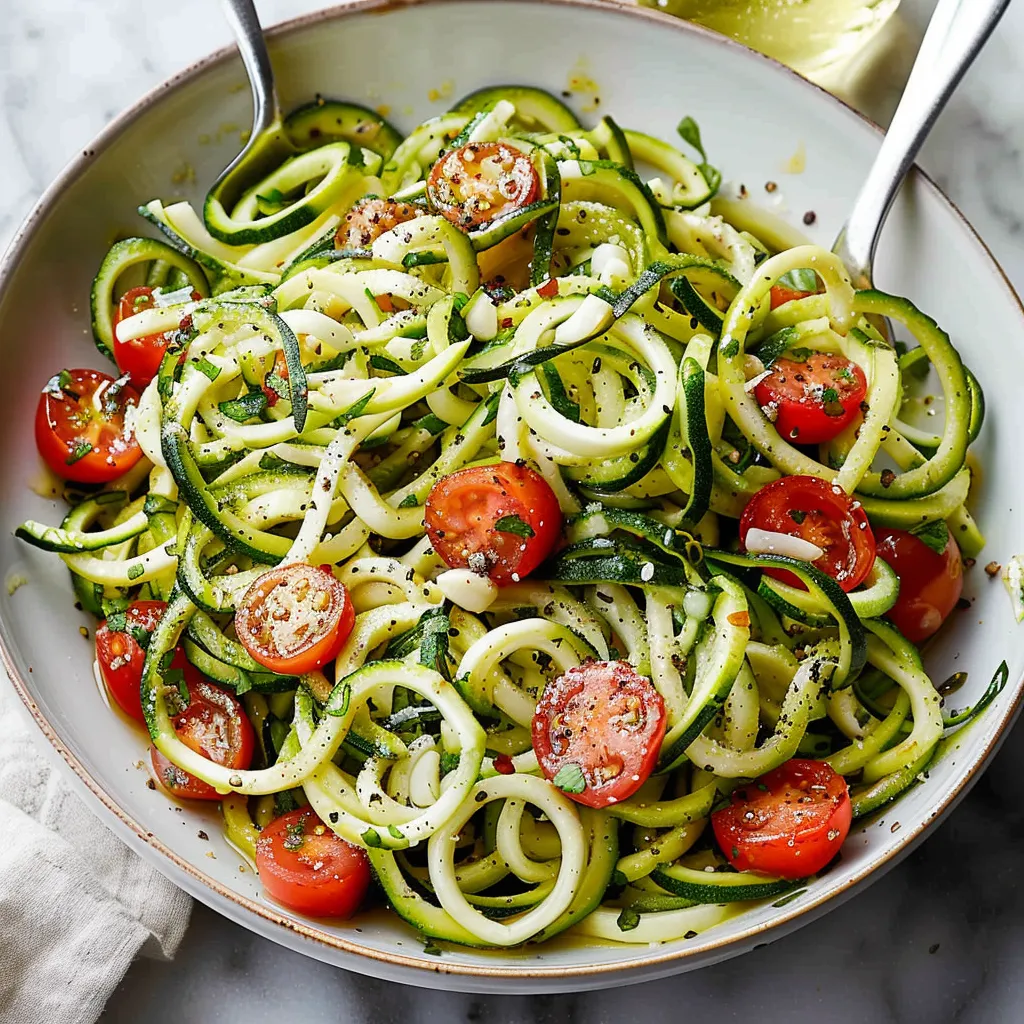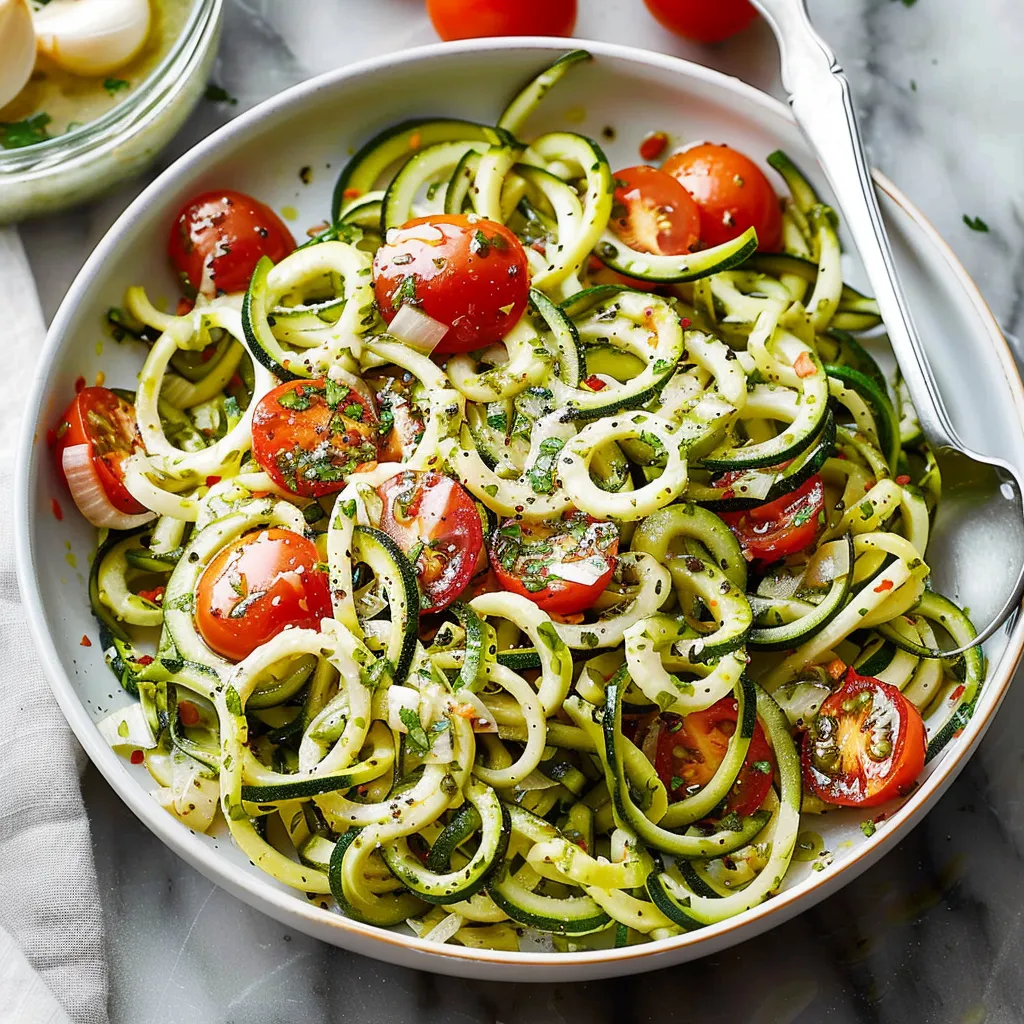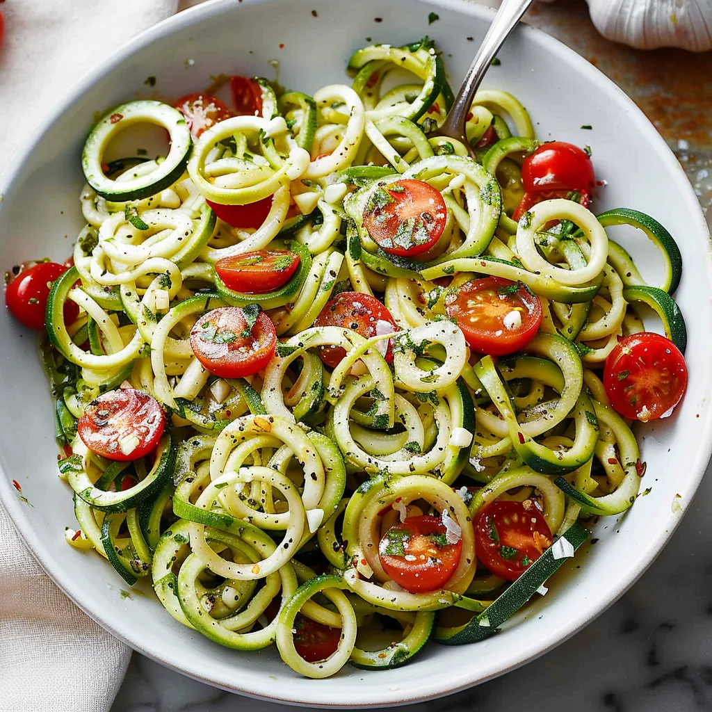 This dish is like a whimsical dance party for your taste buds. The zucchini zoodles provide that perfect “ noodle ” texture, crisp yet tender, while the cherry tomatoes burst with sweetness, much like little summer sun jewels. And let’s not forget the garlic—oh, sweet garlic—infusing the dish with warmth and depth. It all comes together in a beautiful melody of flavors that’s reminiscent of a cozy Italian escape. You dig in and immediately find it’s refreshing yet comforting, like that first warm bite of comfort after a long day, giving you just the right amount of joy you didn’t know you needed. Pure bliss!